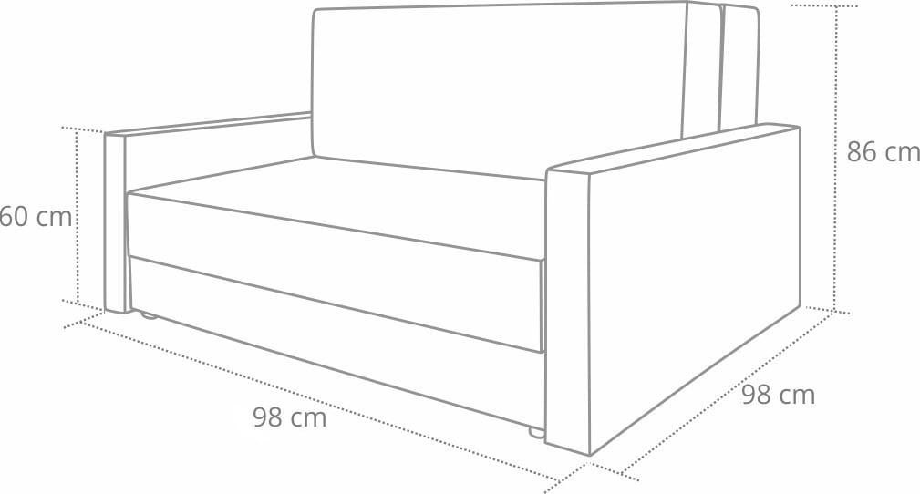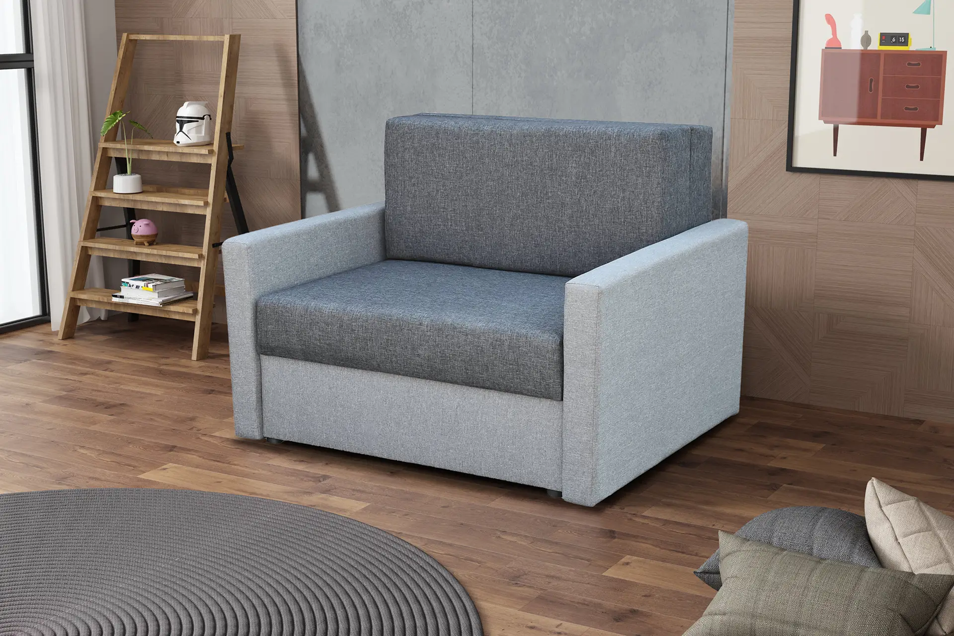 Víceúčelová jednomístná pohovka/křeslo s funkcí spaní. Umožňuje rozložení na dvě různé délky. Skvělá do obývacího pokoje, pracovní místnosti nebo dětského pokoje. Je vybavena velkým boxem na lůžkoviny.