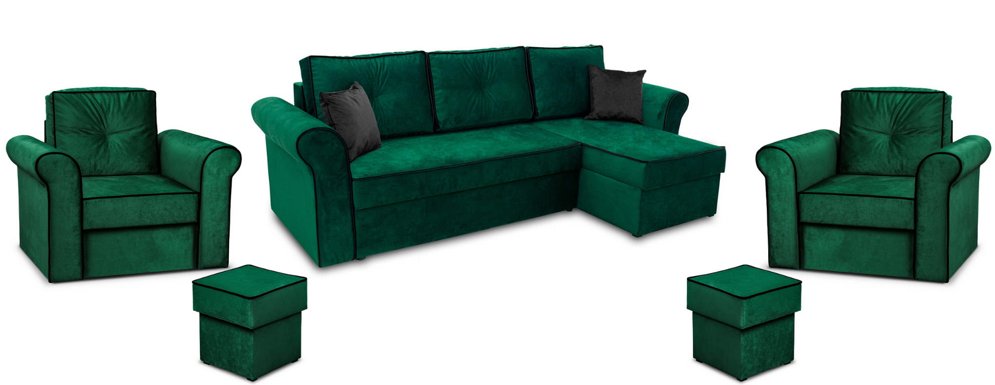 Sedací souprava Trevor rohová pohovka s 2x křeslo s pufem Tmavě zelená