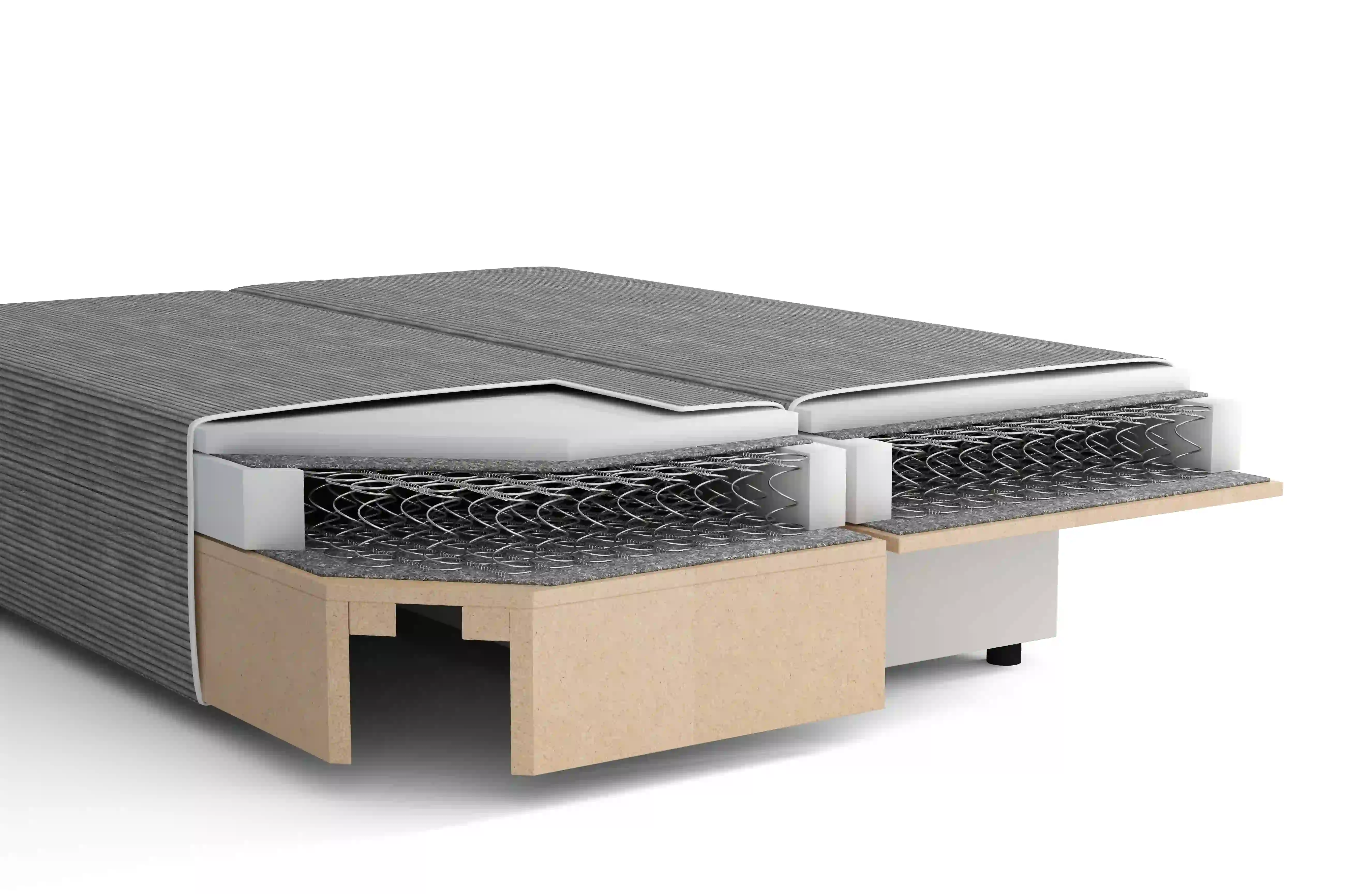 Snadno a rychle přeměníte pohovku na dvoulůžko o rozměrech 140 × 195 cm. Celá spací plocha je vyplněna bonellovými pružinami, které poskytují progresivní tvrdost – vhodné pro osoby všech hmotností. Díky jednotné výšce a výplni získáte pohodlí jako na kvalitní matraci. Rozkládací část je rozdělena v poměru 50:50 – tedy 70 cm na každou polovinu.