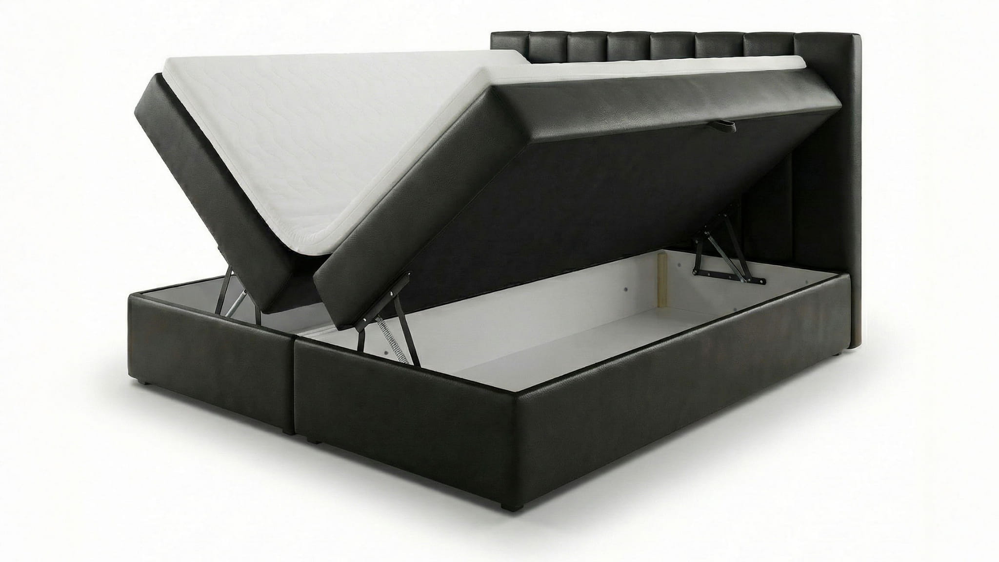 Dva prostorné úložné prostory umožňují pohodlné uložení peřin, polštářů a textilií na dosah ruky a použité mechanismy drží sedací část po otevření v horní poloze, čímž zajišťují bezpečný a volný přístup k úložným prostorům bez rizika náhlého spadnutí a úderu. Jde o řešení, které zvyšuje komfort, bezpečnost a funkčnost postele, zvláště důležité v moderních bytech.