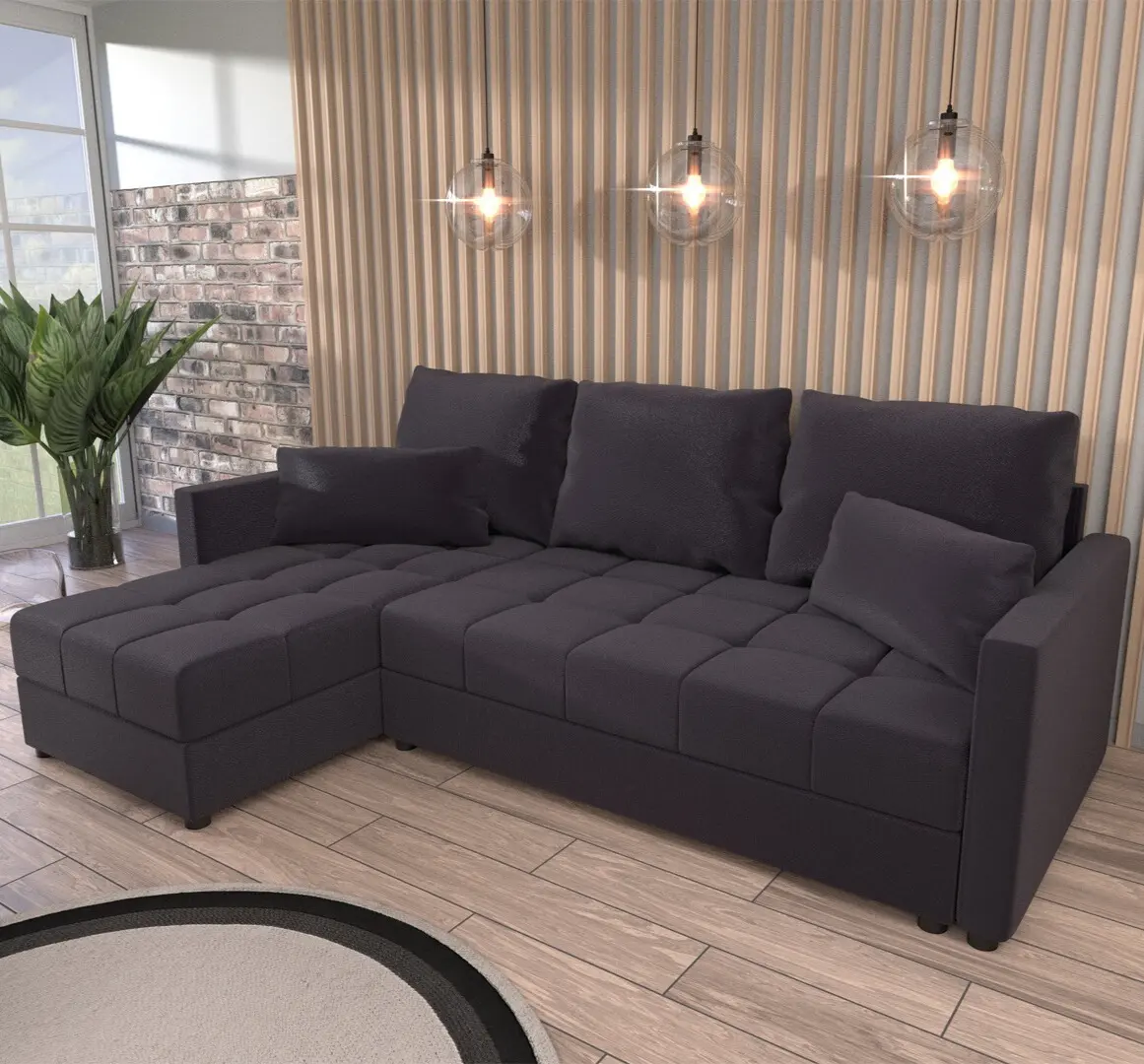 Moderní, stylová a praktická rohová pohovka, která dokonale spojuje estetiku s funkčností. Skvěle se hodí do klasických i moderních interiérů, nabízí pohodlné místo k odpočinku během dne a komfortní postel na noc. Model je vybaven prostorným úložným prostorem na ložní prádlo a praktickým a jednoduchým rozkládacím systémem typu DL – stačí vysunout sedák a sklopit opěradlo, a během okamžiku získáte prostorné místo na spaní. Jeho univerzální konstrukce umožňuje montáž delší části vlevo nebo vpravo – uživatel si sám zvolí, co nejlépe vyhovuje jeho obývacímu pokoji.