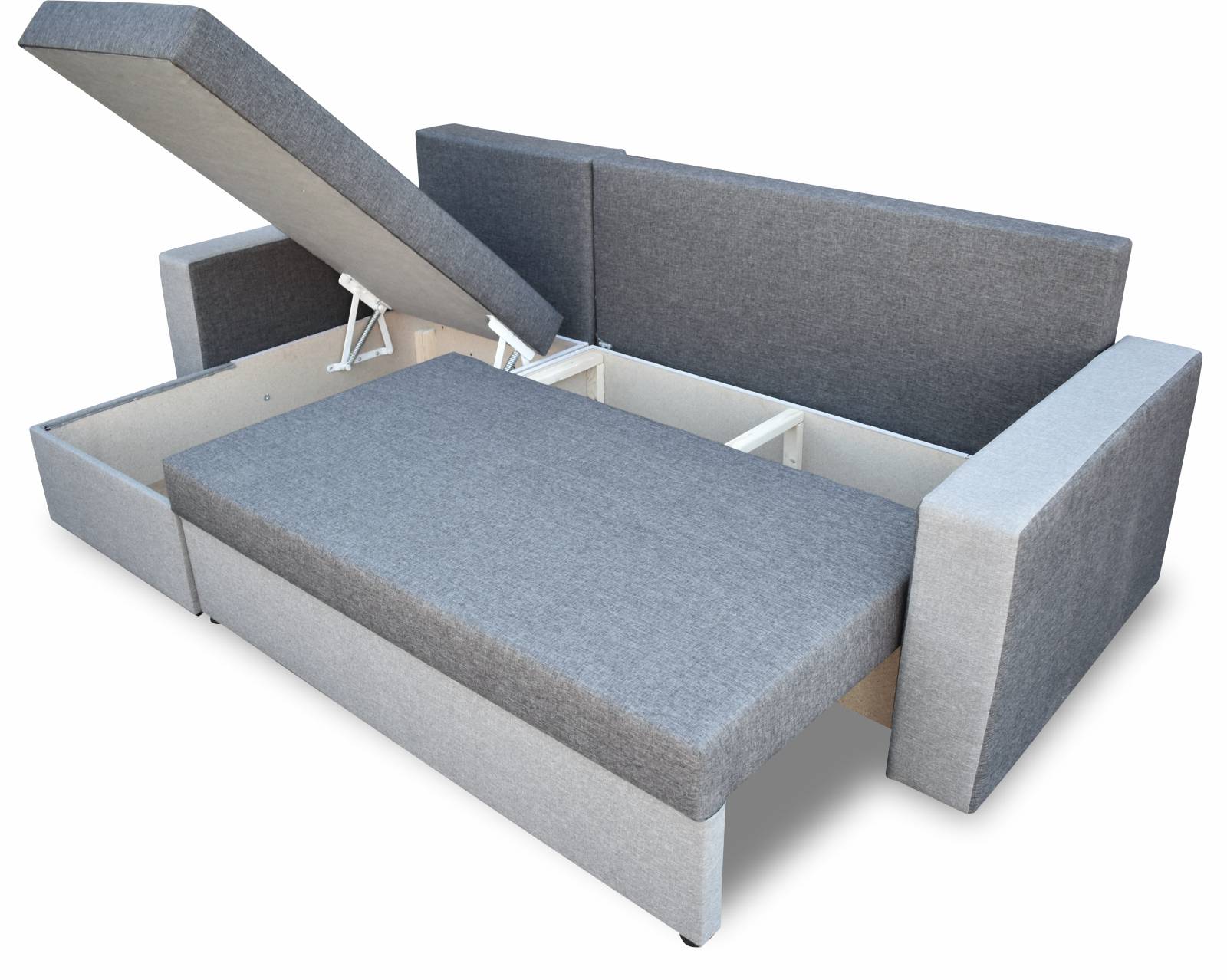 Po rozložení rohové sedací soupravy máte k dispozici plnohodnotné lůžko a až dva kontejnery pro uložení lůžkovin. Kvalitní zpracování rohové pohovky je patrné v každém detailu. Od oboustranných polštářů, které vám dávají možnost měnit barvu rohové pohovky, až po pevné automatické pružiny, které usnadňují rozkládání a skládání nábytku.