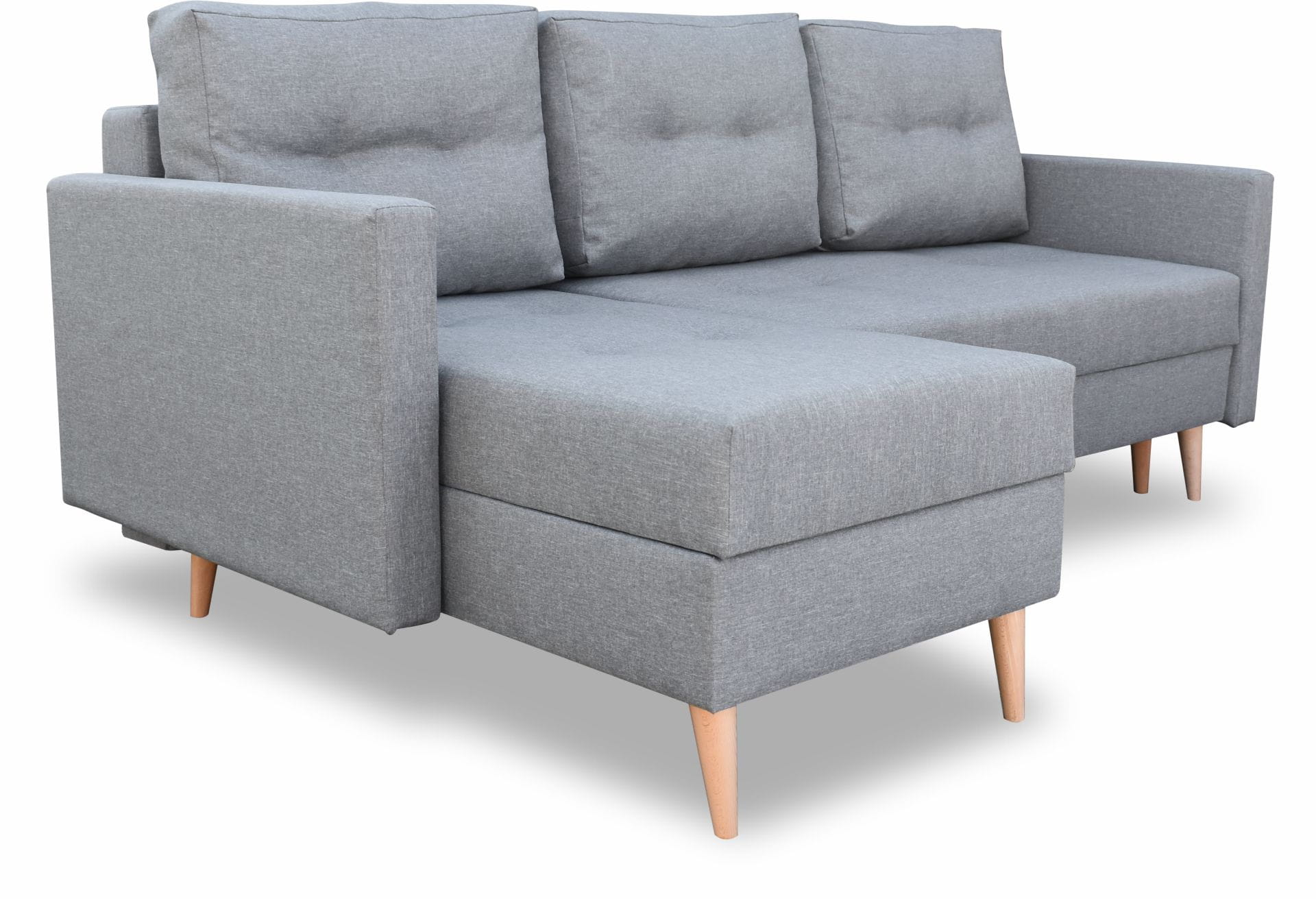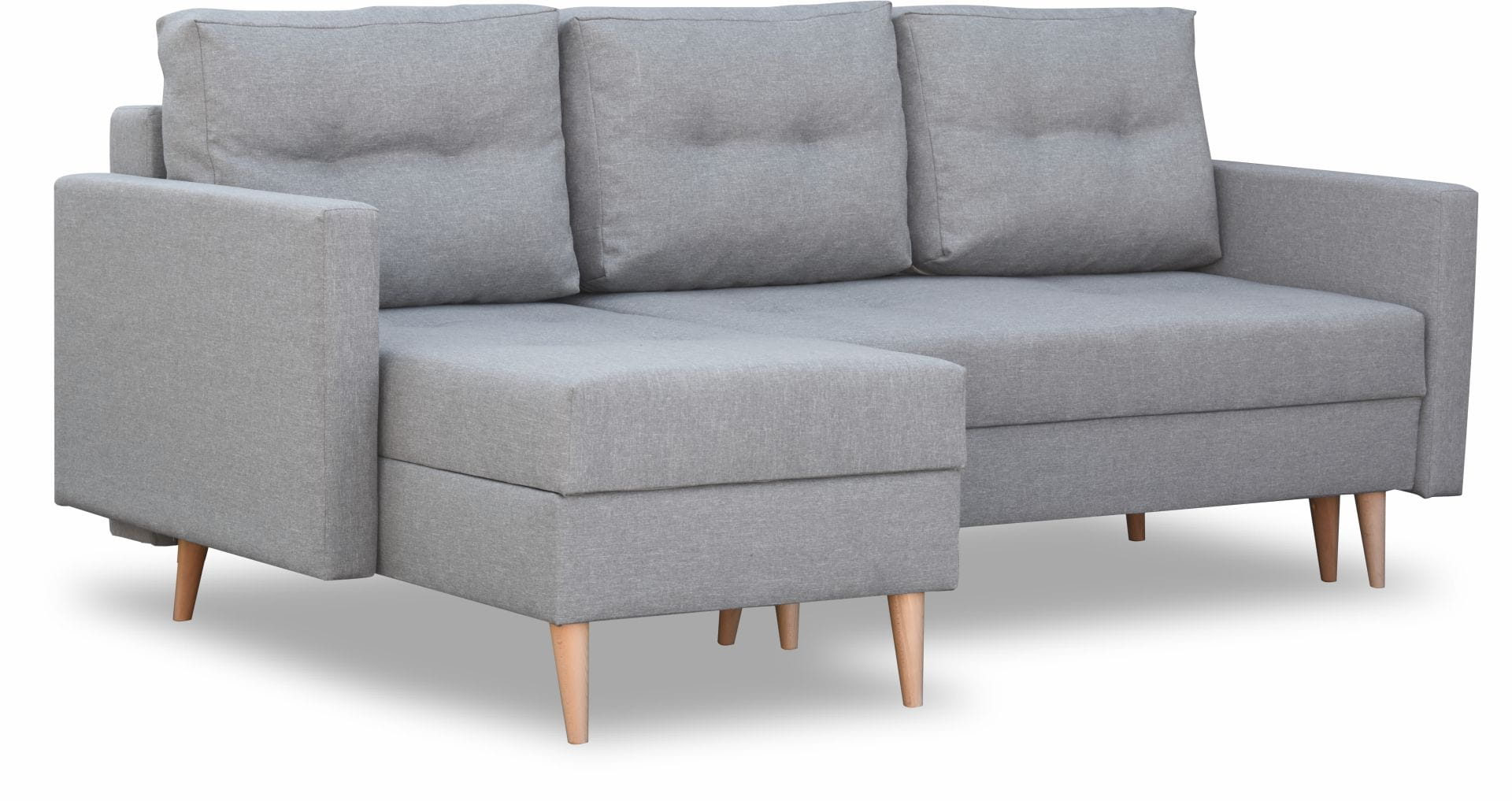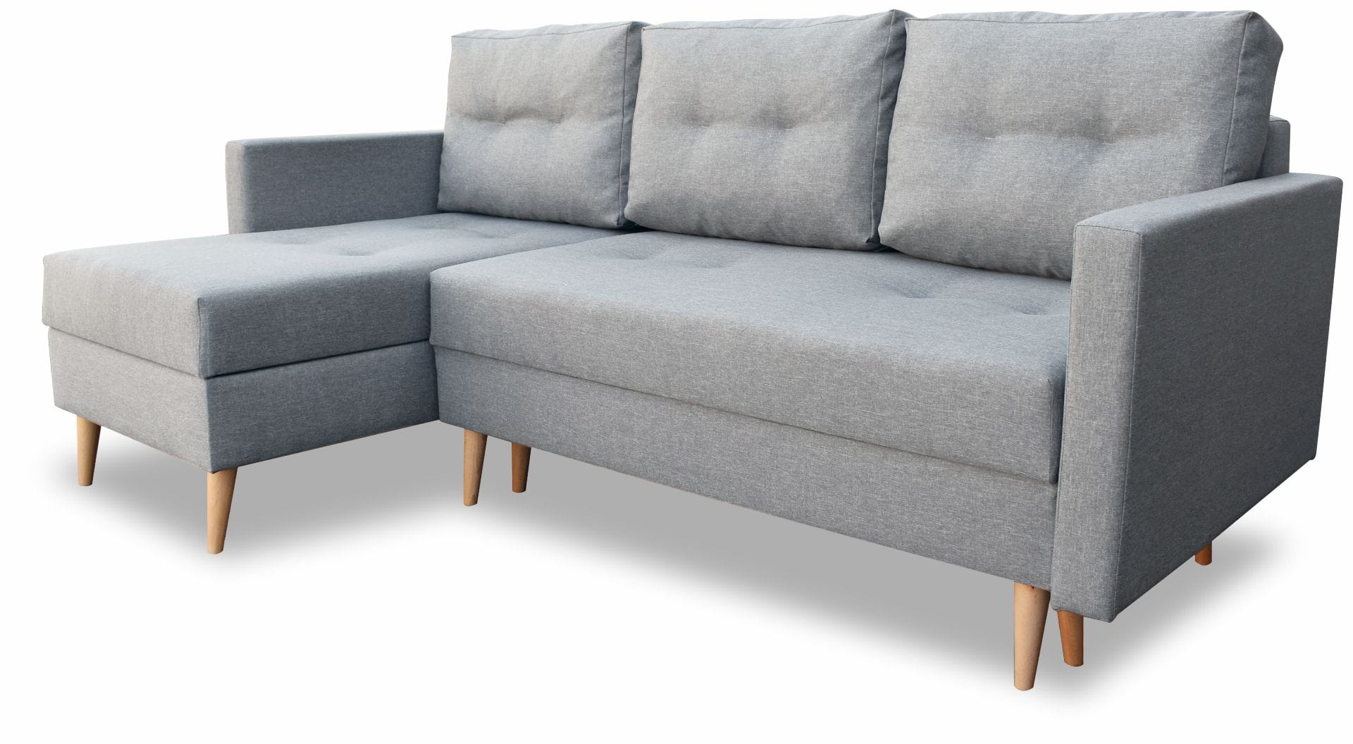 Rohová pohovka Malmö je model ve skandinávském stylu. Díky vysokým dřevěným nohám v přírodní barvě a šedému tříslovinnému provedení tento výrobek dokonale zapadá do převládajících trendů v interiérovém designu. Pohovka má dva úložné prostory na lůžkoviny a funkci spaní, díky níž lze nábytek přeměnit na manželskou postel o rozměrech 140x200 cm
