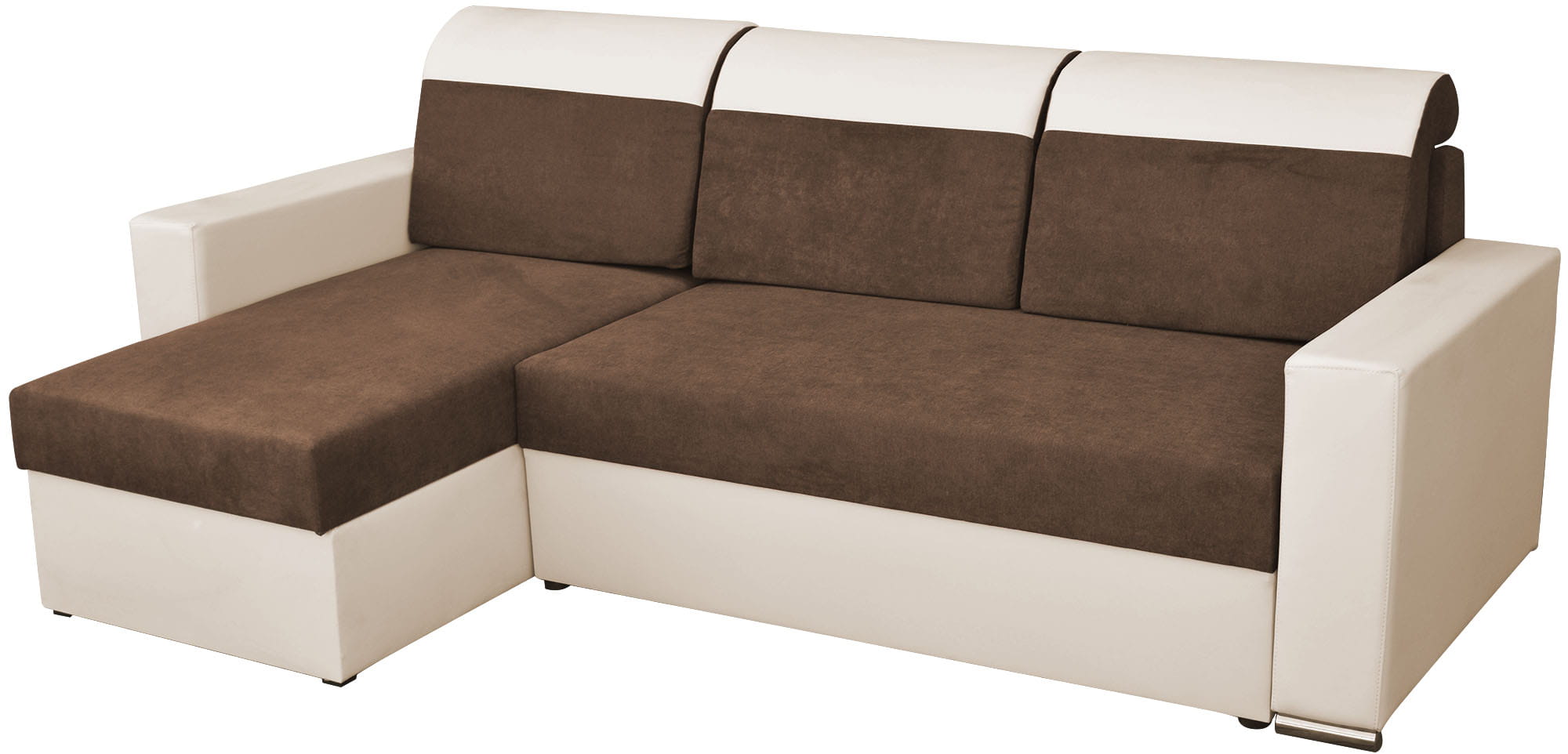 Moderní, mimořádně funkční a pohodlná - to jsou nejdůležitější vlastnosti naší rohové sedací soupravy. Tři tvarované polštáře vytvářejí velmi pohodlné opěradlo a použité bonellové pružiny jsou zárukou pohodlného spánku a dlouhodobé odolnosti. Kombinace ekologické kůže a látky s ochrannou vrstvou, která zabraňuje nasáknutí tekutin, poskytuje nejen mimořádný vzhled, ale je také zárukou zachování dokonalé čistoty výrobku
