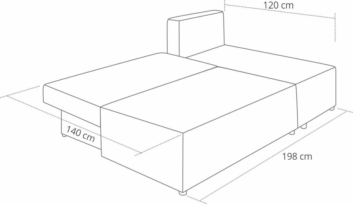 Moderní rohová pohovka v minimalistickém designu. Ocení ji zejména ti, pro které je důležitý každý metr čtvereční prostoru. Ideální do menších bytů nebo dětských pokojů. Díky možnosti rozkladu umožňuje vytvořit velké lůžko. Vestavěný kontejner na lůžkoviny se postará o pořádek ve vaší domácnosti