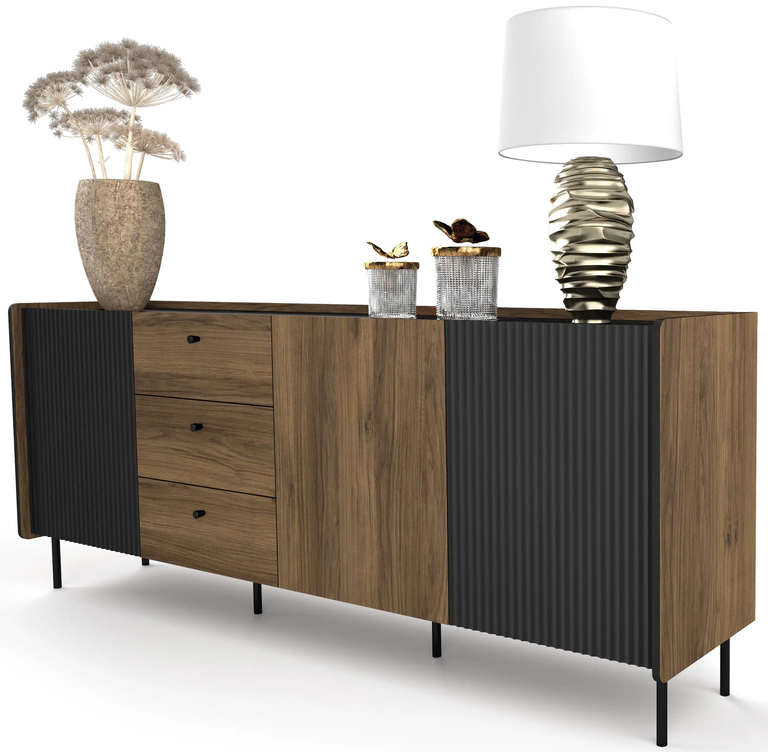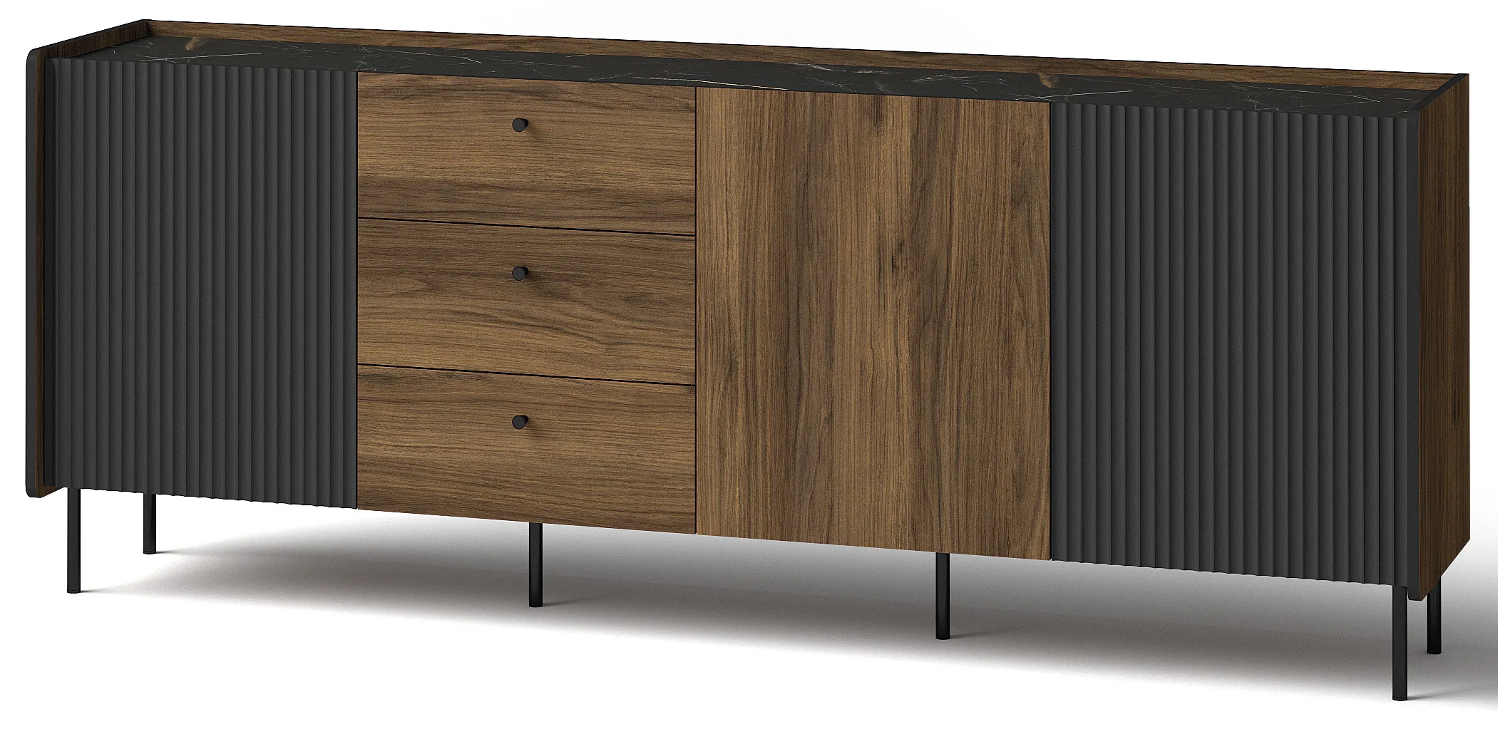 Tato exkluzivní komoda byla vyrobena z vysoce kvalitní laminované desky, což zaručuje její dlouhou životnost. Její matná povrchová úprava jí dodává elegantní vzhled a díky tomu se skvěle hodí do různých typů interiérů. Stylové kovové nožky podtrhují moderní charakter nábytku, zatímco kuličkové pojezdy zajišťují hladké otevírání a zavírání zásuvek bez jakýchkoli překážek. Nejen vzhled, ale i kvalita našeho nábytku stojí na nejvyšší úrovni. Komoda z kolekce "Prestigo" je synonymem vysoké kvality a inovativního designu. Pokud hledáte dokonalý kus nábytku do svého obývacího pokoje, který spojuje styl s funkčností, třídveřová komoda o délce 200 cm je ideální volbou. Dodejte svému interiéru eleganci a jedinečnost - objednejte si ji nyní!