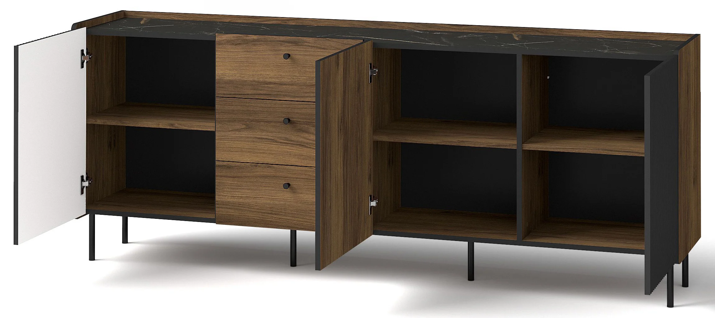 Tato komoda se skvěle hodí do moderních interiérů a dodá jim sofistikovaný nádech. Zaručujeme vám, že naše komoda vás okouzlí nejen svým designem, ale poskytne vám i funkční řešení úložného prostoru. Tři výklopná dvířka a šest polic poskytují dostatek prostoru pro všechny vaše nezbytnosti, zatímco až tři zásuvky vám umožní oddělit menší předměty a udržet tak ve vašem obývacím pokoji pořádek.