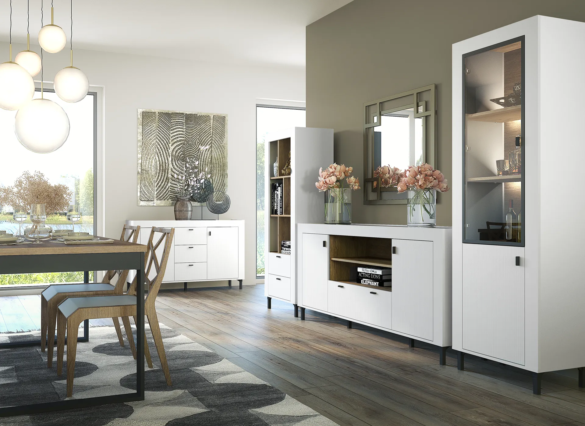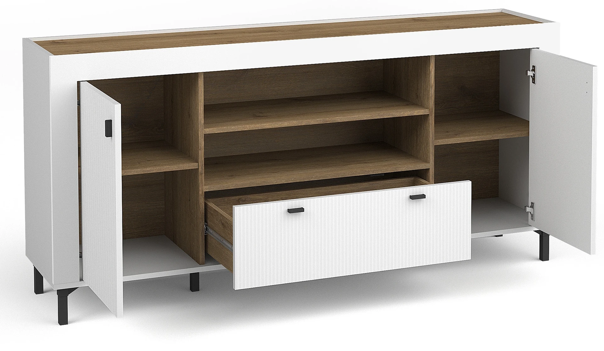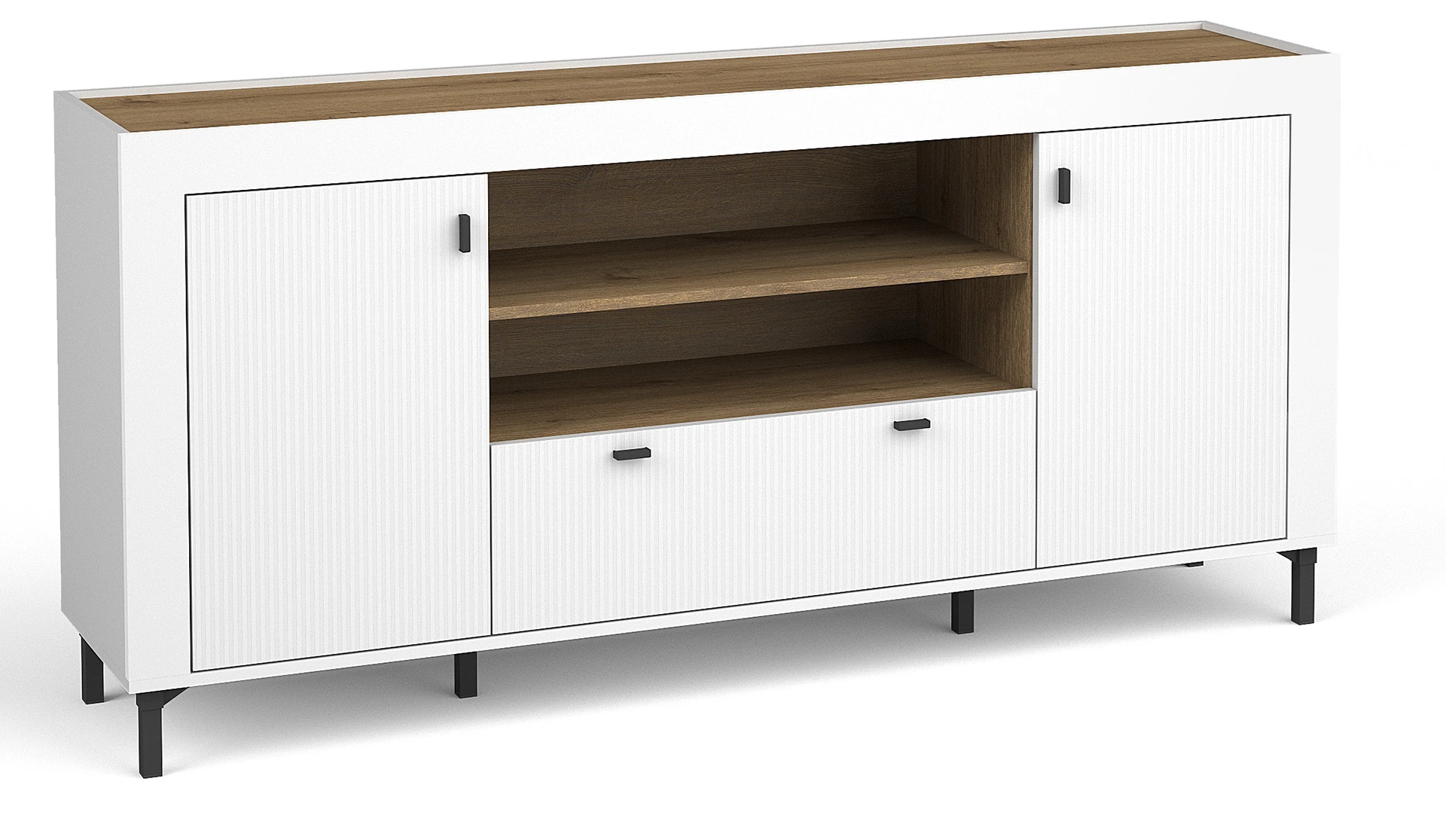 Tato komoda nabízí kombinaci uzavřených skříněk a otevřené police, což vám umožní uložit různé předměty i elegantně vystavit dekorace nebo knihy. Tím nejen uspořádáte svůj prostor, ale také mu dodáte estetický a osobní nádech. Je to ideální místo pro uspořádání věcí, které chcete mít neustále po ruce, a zároveň udržuje pořádek v místnosti. Harmonická barevná kombinace bílá/dub whisky doplňuje různé styly interiérů a dodává jim eleganci a modernost.