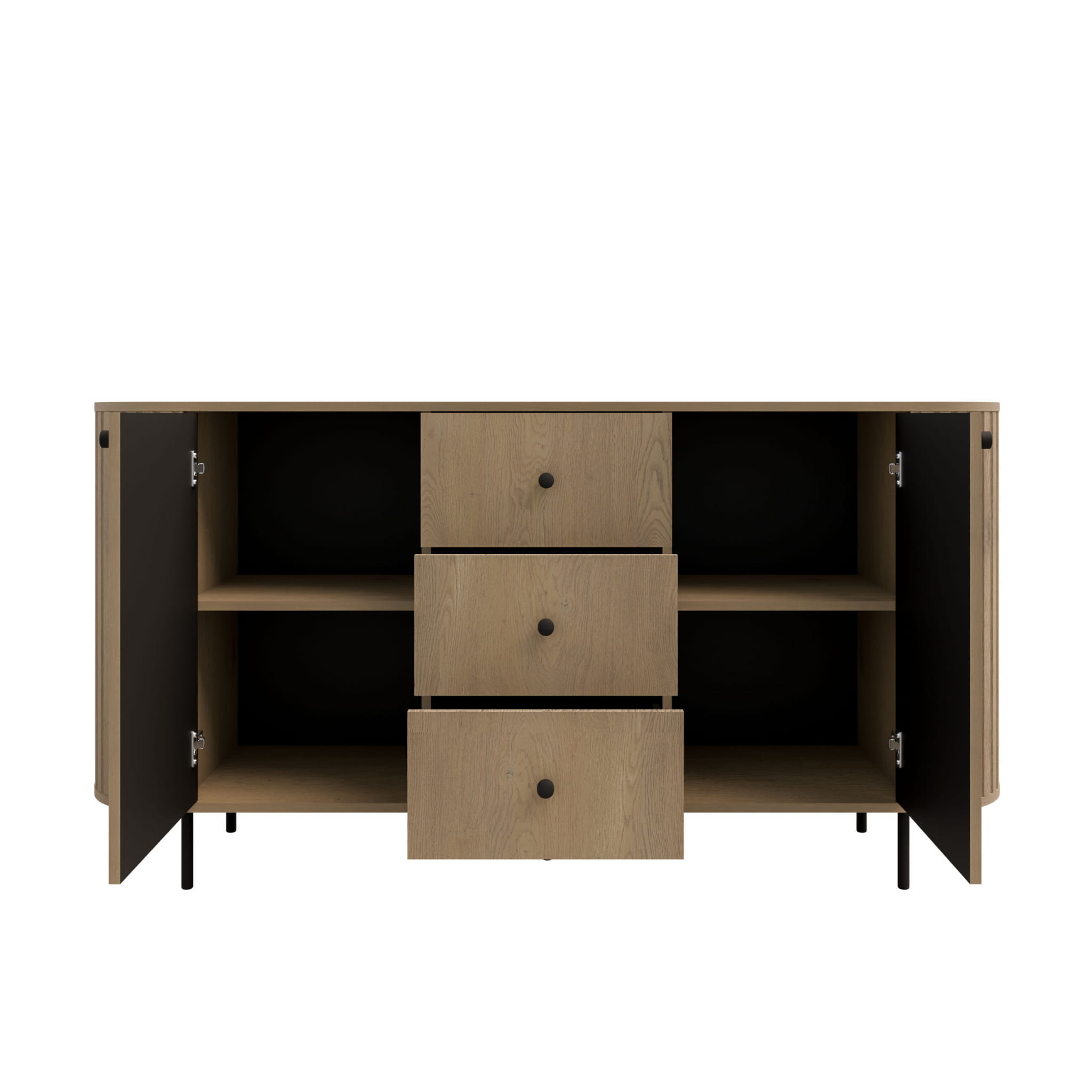 Komoda Flana 823 2F3S v dekoru dub Cremona spojuje eleganci a praktičnost. Dvoje dvířka a tři prostorné zásuvky umožňují pohodlně uspořádat dokumenty, textilie nebo drobné doplňky. Černé úchyty a štíhlé kovové nožky dodávají celku moderní, výrazný charakter. Interiér v odstínu dub Cremona s černými prvky podtrhuje precizní design a tichý dověr zvyšuje komfort každodenního používání.
