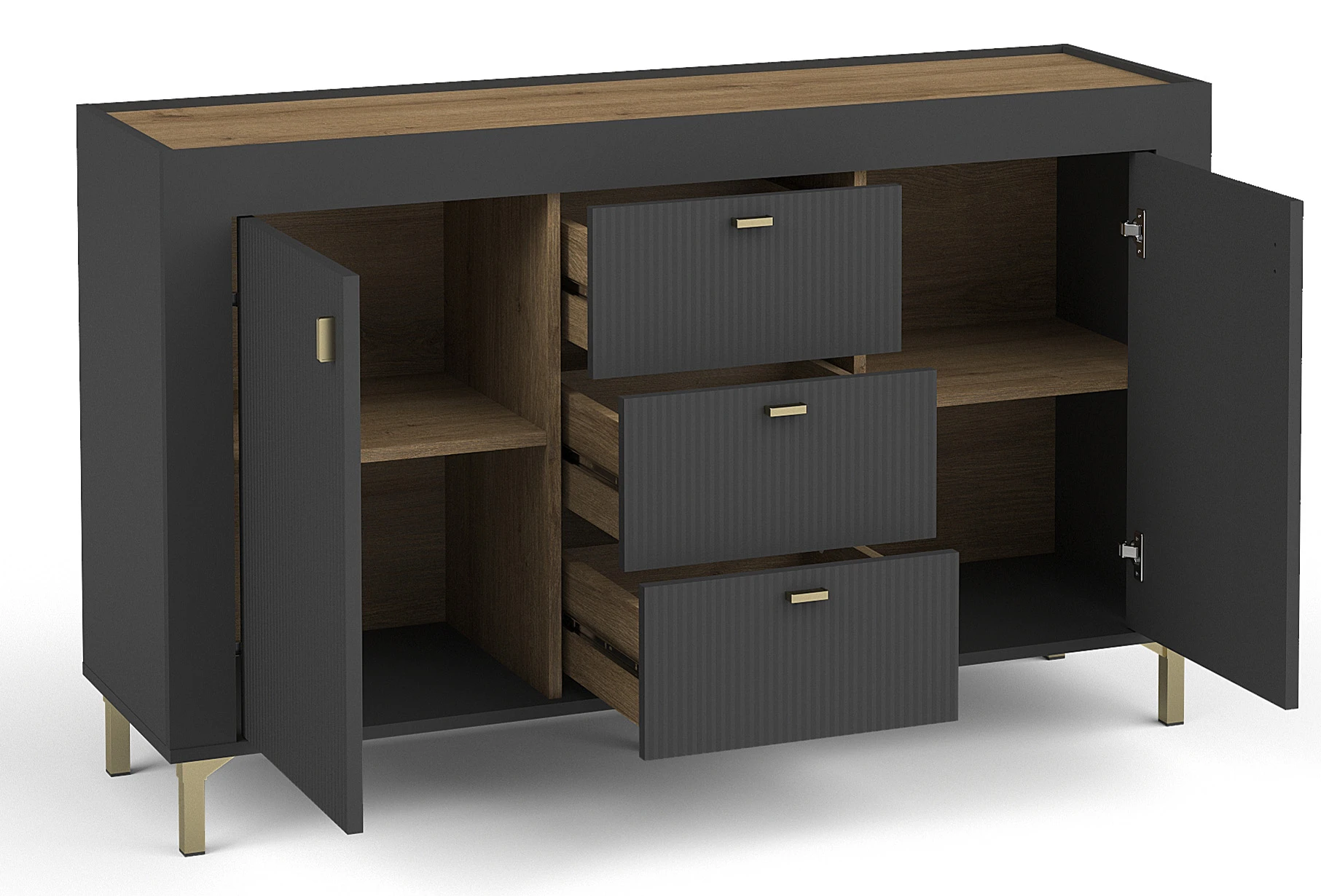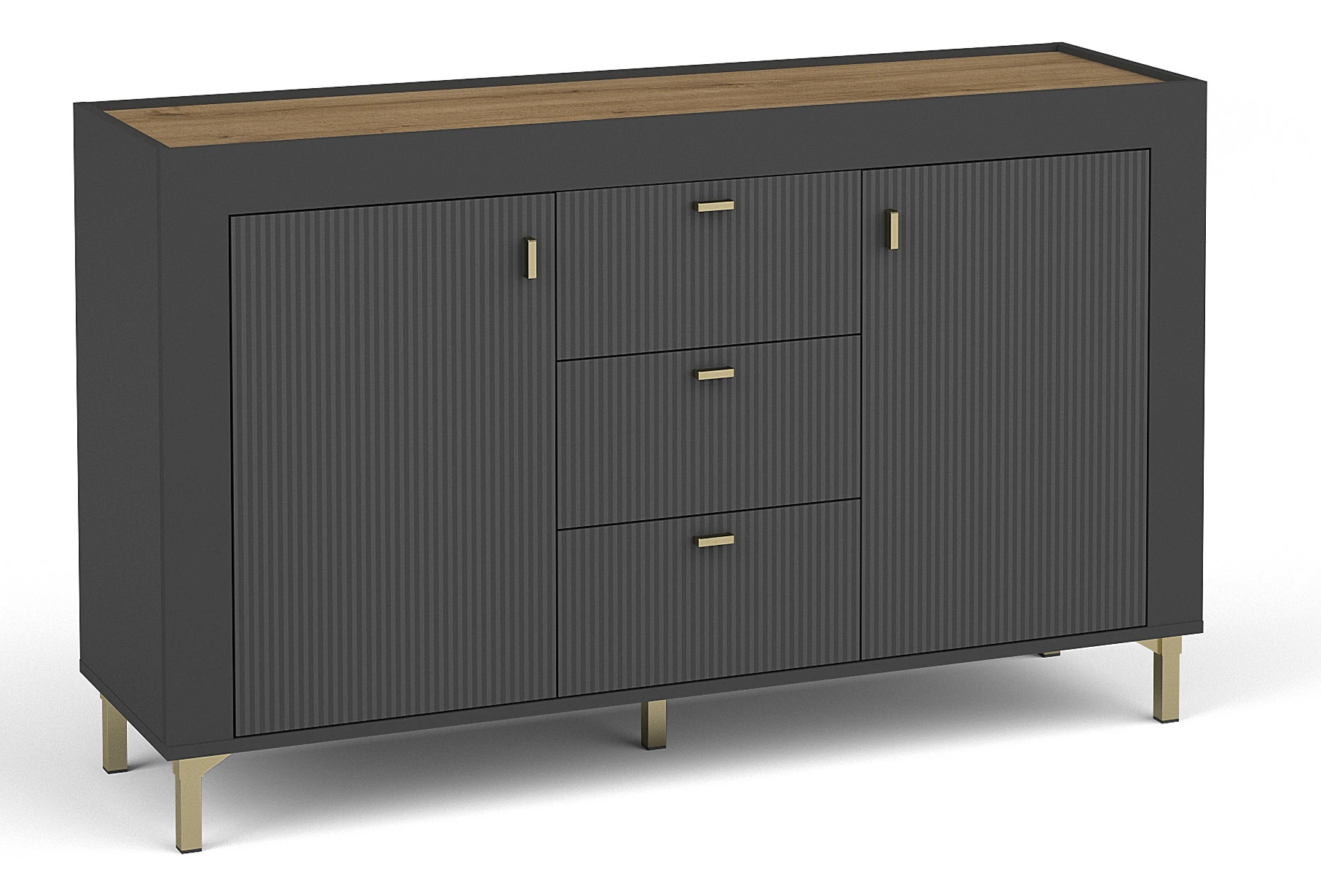 Novinka v kolekci Mossa! Tato stylová dvoudveřová komoda se třemi zásuvkami je dokonalým řešením pro váš obývací pokoj. Elegantní design v kombinaci s funkčností dodá vašemu interiéru nový charakter. Konstrukce o rozměrech 137,3x40x83,6 cm poskytuje dostatek úložného prostoru, který je ideální pro uložení různých předmětů. Komoda vyrobená z laminované desky v černé barvě a dubu whisky se hodí do moderních i klasických uspořádání. Objednejte si ji nyní a užijte si eleganci a praktičnost v jednom!