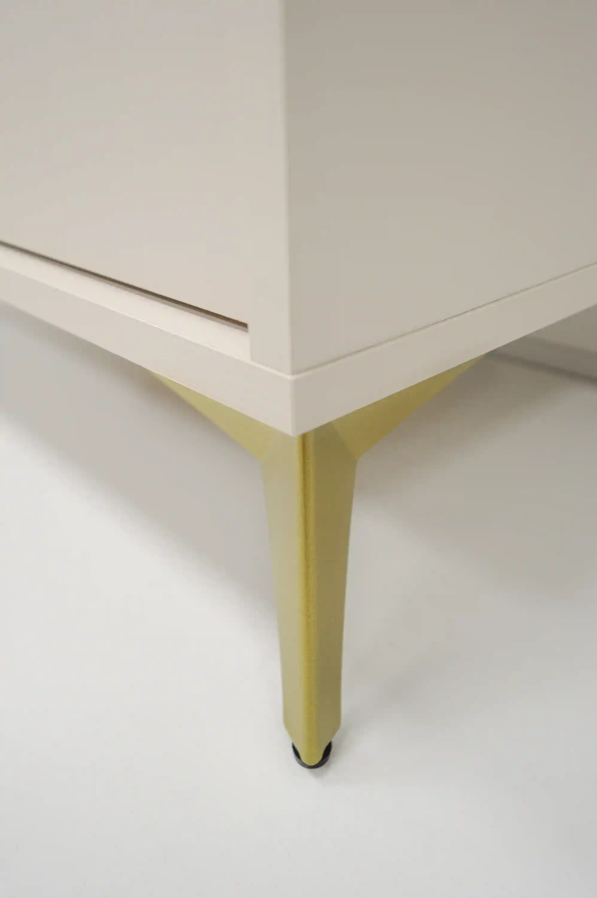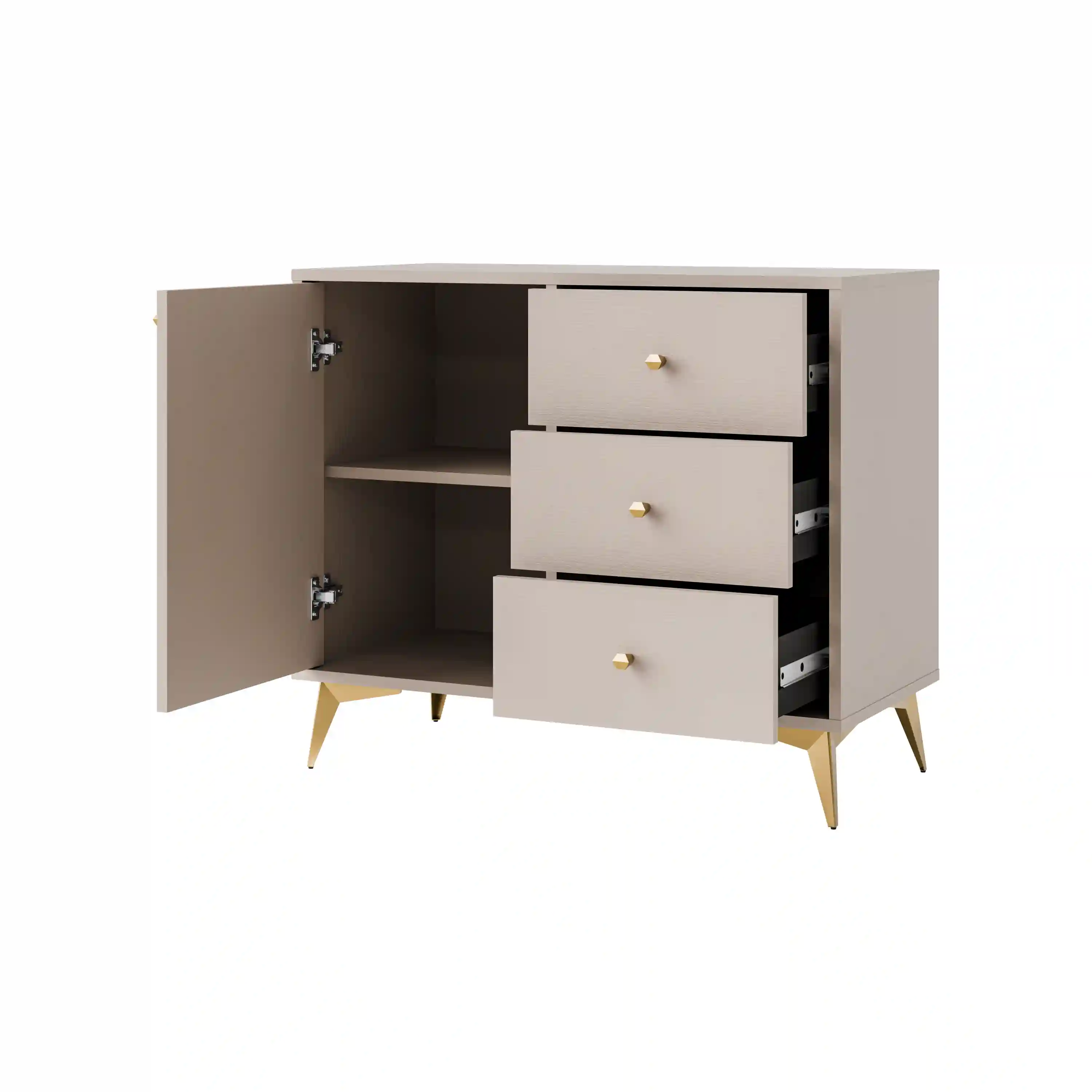 Funkční komoda se třemi zásuvkami a skříňkou s jedněmi dveřmi a vnitřní policí. Nábytek stojí na vysokých zlatých kovových nožkách, které podtrhují lehkost a usnadňují úklid. Dokonalé provedení doplňují zlaté kovové úchytky a jemně strukturované čela.