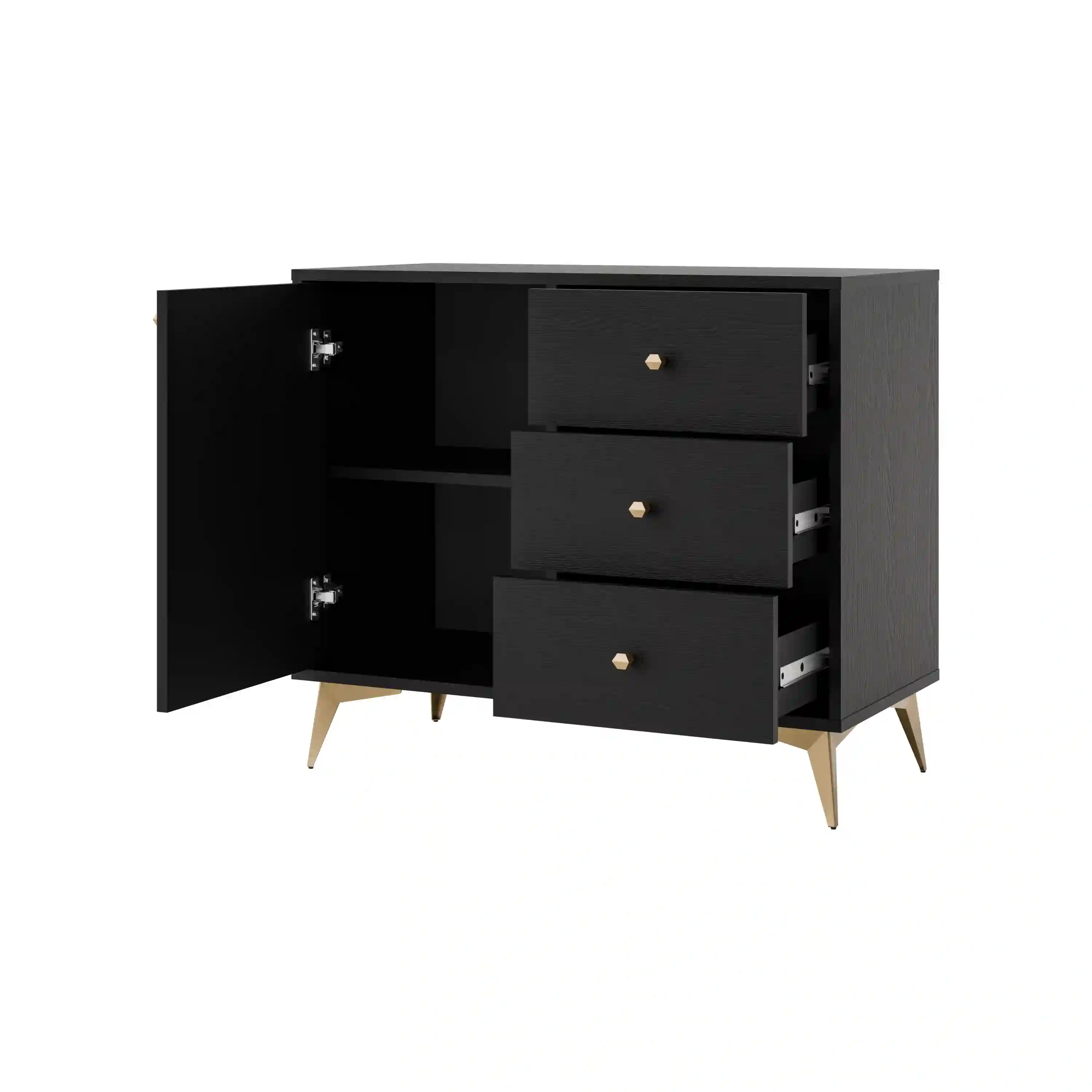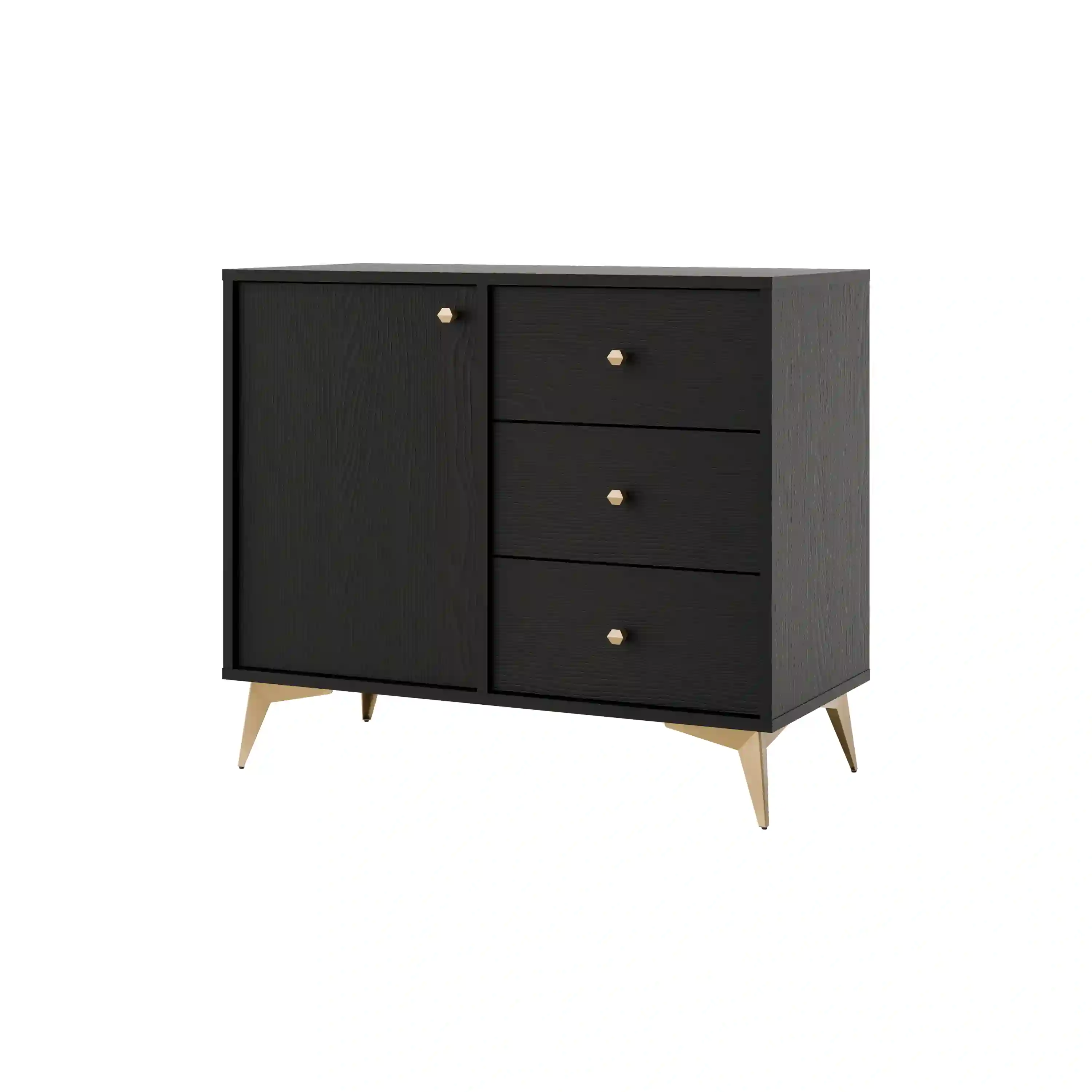 Funkční komoda s jedněmi dvířky a třemi zásuvkami. Na vysokých zlatých kovových nohách pro lehkost a snadný úklid. Dokončeno zlatými kovovými úchyty a jemnou strukturou čel.