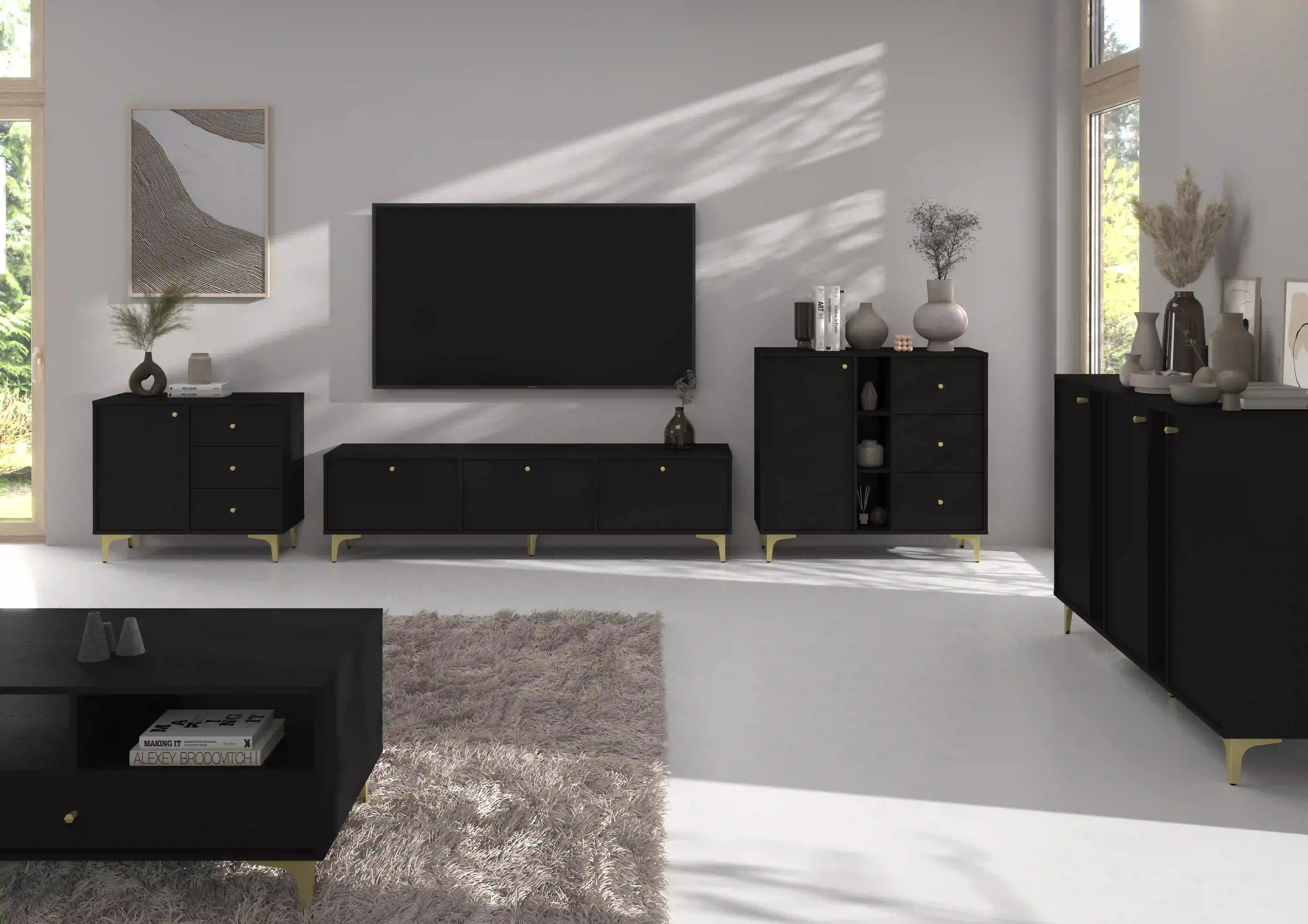 Komoda je ideální jako doplňkový úložný prostor v obýváku či ložnici. Díky kompaktním rozměrům se vejde i do menších místností a promyšlená vnitřní organizace pomáhá udržet pořádek. Zlaté detaily ji zároveň činí dekorativním prvkem.