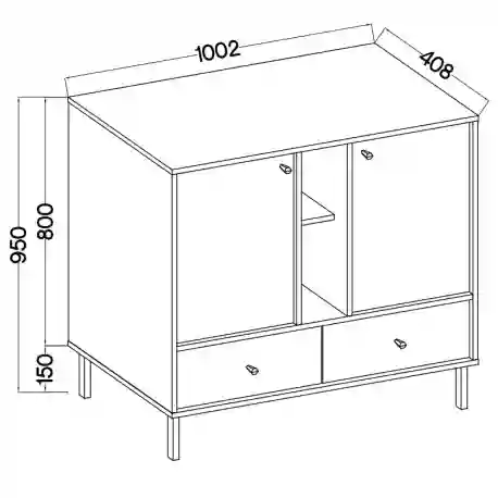Elegantní komoda na zlatých kovových nohách spojuje funkčnost s moderním designem. Vybavena dvěma výklopnými dvířky, dvěma zásuvkami a třemi policemi – jednou otevřenou a dvěma uvnitř –, nabízí praktické úložné i prezentační možnosti. Zlaté kovové knopky podtrhují stylový charakter. Ideální do obýváku, ložnice či předsíně.