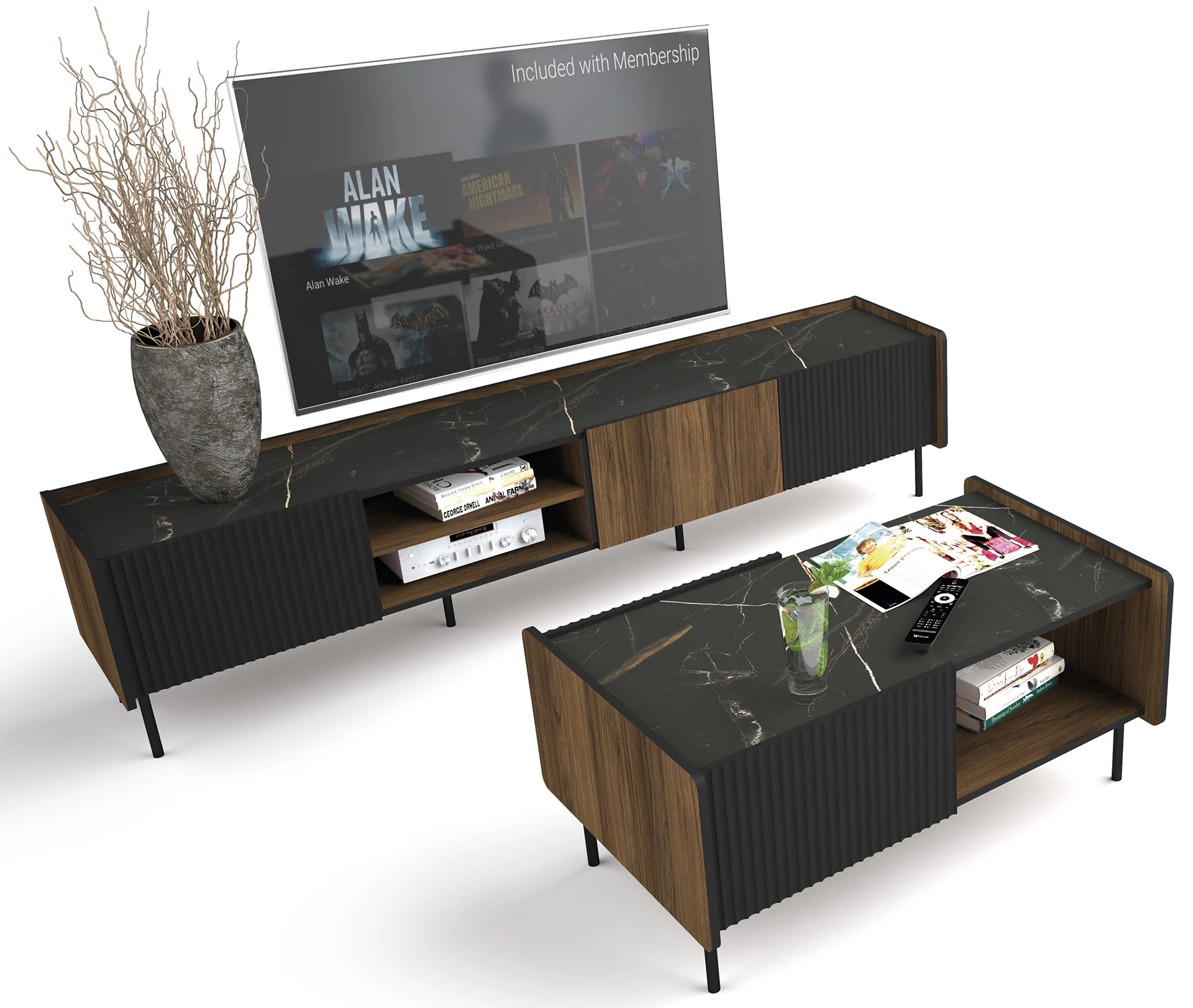 V řadě Prestigo najdete 17 kusů, ze kterých si můžete vytvořit vlastní sestavy a aranžmá. Kolekce obsahuje: komody, vitríny, RTV skříňky, stůl, lavici, postel, noční stolky a psací stůl. Jednoduché tvary a kombinace ořechové barvy s černou dodávají nábytku moderní a originální charakter. Nábytek Prestigo je skvělým řešením, pokud hledáte moderní nábytek do obývacího pokoje nebo jiné místnosti.