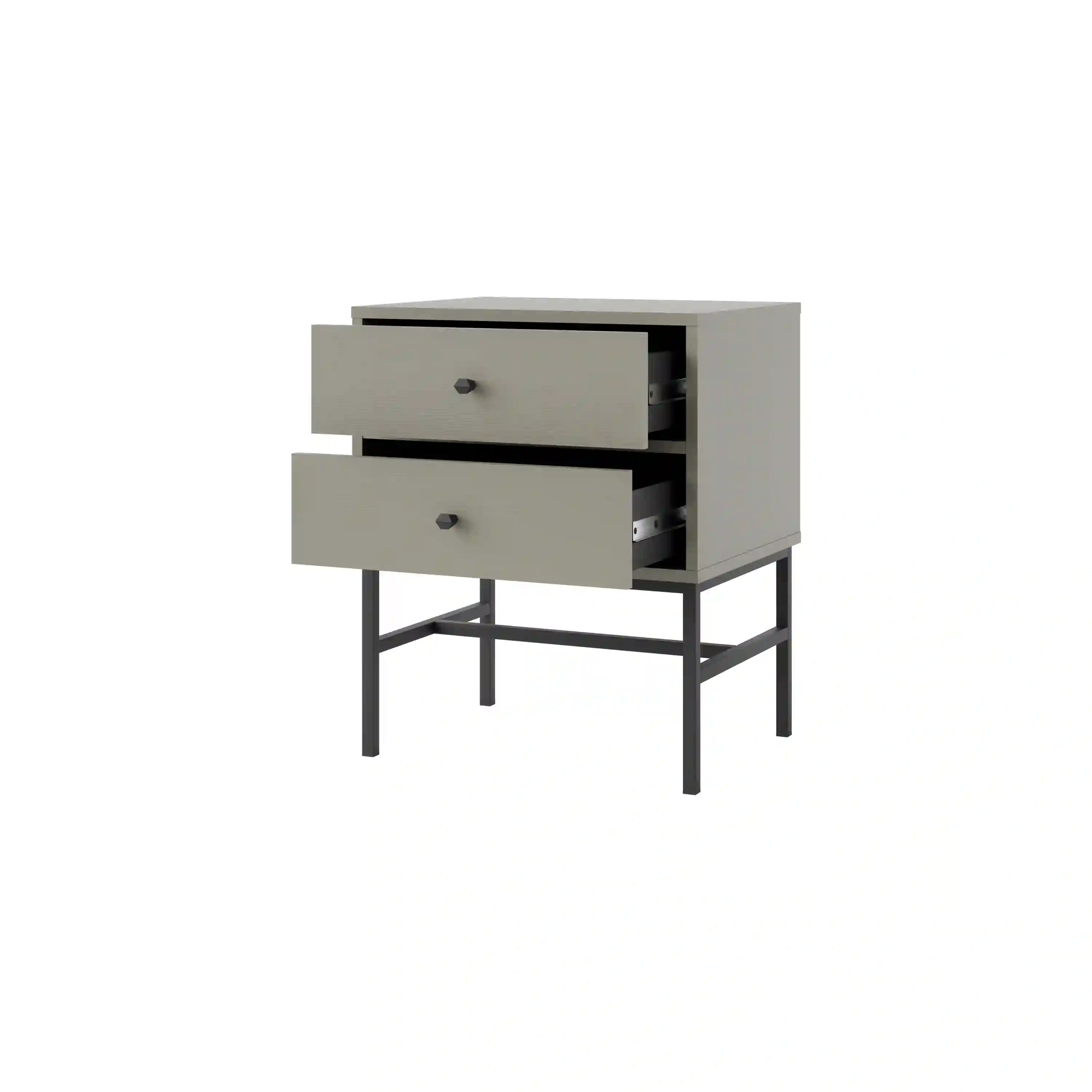 Praktický noční stolek vybavený dvěma prostornými zásuvkami, které usnadňují uložení drobností a udržení pořádku v ložnici. Model je charakteristický černými kovovými knopkami a kuličkovými pojezdy, které zajišťují plynulé a tiché otevírání zásuvek.
