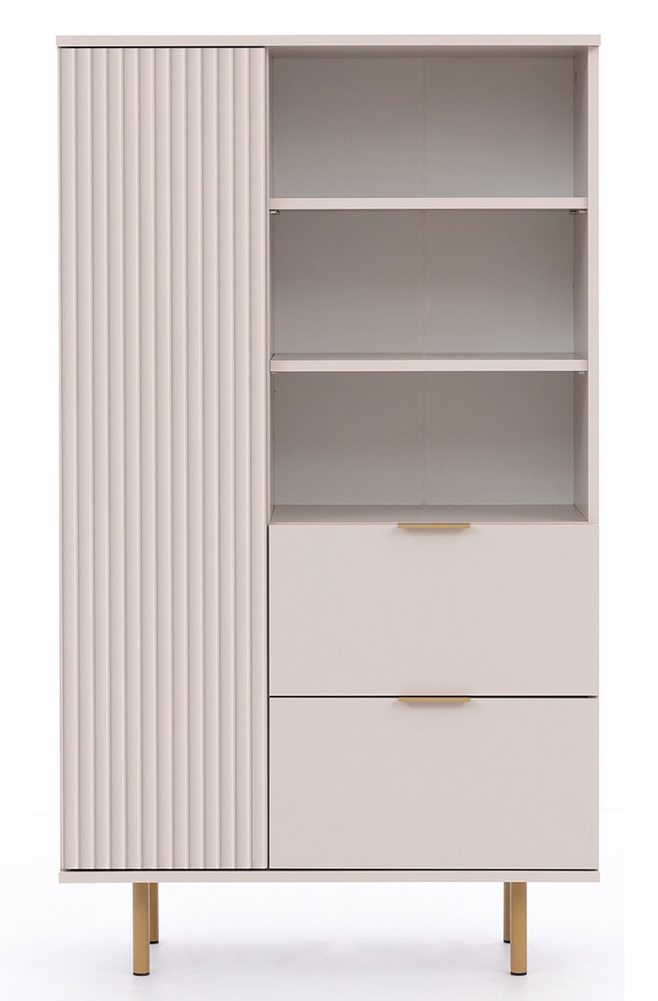 Jedinečná knihovna Nubia R1D2SZ je harmonickou kombinací funkčnosti a elegantního designu. Ideální do obývacího pokoje nebo ložnice. Detailně propracovaný interiér s policemi, zásuvkami a dvířky poskytuje dostatek úložného prostoru a usnadňuje každodenní udržování pořádku. Matná povrchová úprava v kašmírových tónech vnese do vašeho interiéru jemný nádech stylu. Nadčasový tvar s kovovými nožkami dodává knihovně lehký a moderní nádech. Získejte nejen praktické úložné řešení, ale také designový dekorativní prvek, který podtrhne charakter vašeho prostoru. Jistě potěší vaše hosty a ve vašem interiéru se bude cítit příjemně.