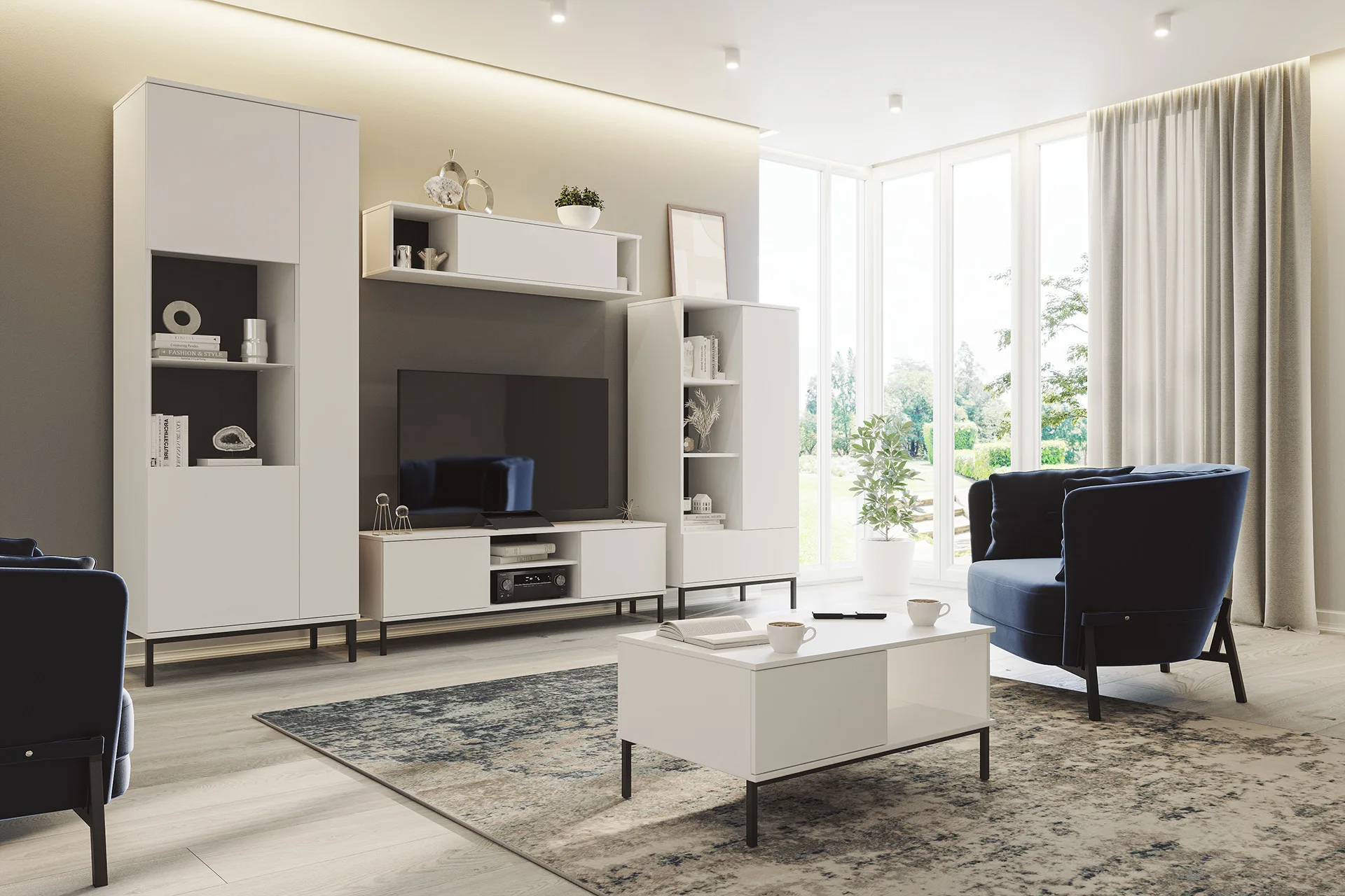 Kolekce Querty představuje elegantní a funkční řešení pro každý interiér, které kombinuje moderní design s praktickým využitím. Kolekce obsahuje komodu, knihovnu, RTV skříňku, konferenční stolek a nástěnnou skříňku, které dohromady vytvářejí ucelené a harmonické uspořádání. Každý kus byl navržen tak, aby maximálně využil prostor a nabídl dostatek místa pro uložení a vystavení dekorací. Knihovna je ideální pro ukládání knih a ozdob, zatímco skříňka RTV poskytuje ideální místo pro multimediální zařízení. Konferenční stolek kombinuje styl a funkčnost a představuje ústřední bod obývacího pokoje. Nástěnná skříňka dodává interiéru lehkost a nabízí další prostor pro nezbytné věci.