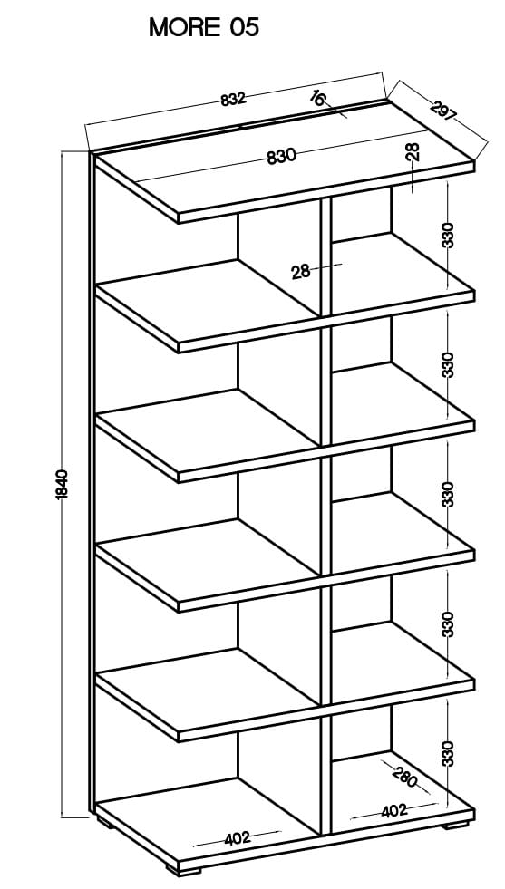 Knihovna More se skládá ze šesti nebo deseti polic v závislosti na zvolené výškové variantě. Všechny police mají stejné rozměry 40x28 cm. Výška každé police v knihovně je 33 cm. To znamená, že se na tyto police snadno vejdou i knihy formátu A4. Horní část knihovny má navíc police široké 83 cm, takže je čím ji zaplnit!