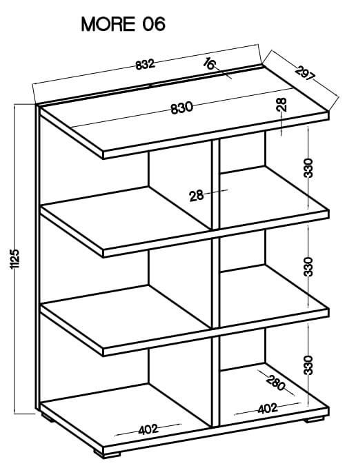 Knihovna More se skládá ze šesti nebo deseti polic v závislosti na zvolené výškové variantě. Všechny police mají stejné rozměry 40x28 cm. Výška každé police v knihovně je 33 cm. To znamená, že se na tyto police snadno vejdou i knihy formátu A4. Horní část knihovny má navíc police široké 83 cm, takže je čím ji zaplnit!