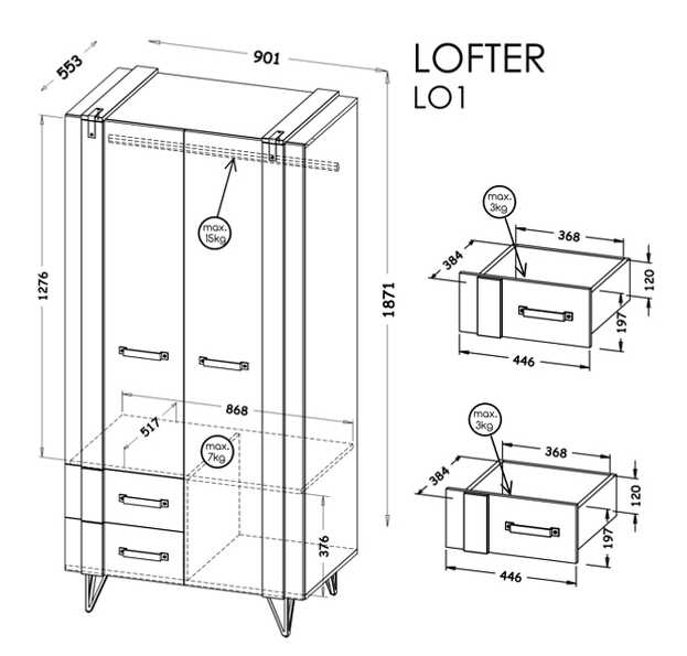 Skříň je vybavena 2 zásuvkami, výklopnými dvířky a 1 tyčí a poskytuje dokonalé místo pro uspořádání oblečení, bot a dalších doplňků. Celý design je v moderním stylu, který dodá vaší ložnici na eleganci. Šatní skříň Lofter LO1 je nejen praktickým řešením, ale také designovým prvkem, který dodá šmrnc každé místnosti. Oslňte své hosty jedinečným designem a funkčností skříně, která splní vaše očekávání a promění prostor vaší ložnice!
