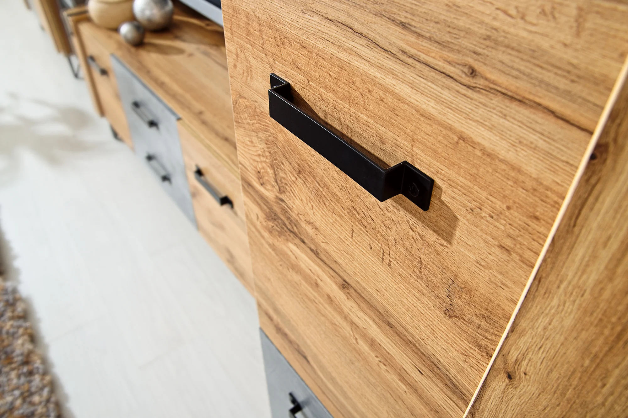 Kolekce nábytku působí výjimečně moderně a stylově díky použití vysoce kvalitních materiálů a inovativnímu designu. Korpusy nábytku jsou vyrobeny z odolných laminovaných dřevotřískových desek v barvě dubu Wotan, což jim dodává elegantní vzhled a zajišťuje dlouholetou životnost. Čela jsou naopak vyrobena ze stejně kvalitního materiálu ve dvou různých barvách: Dub Wotan a beton Millenium, což dodává kolekci jedinečný charakter a kontrast. Nábytek je navíc vybaven černými kovovými nohami, které mu dodávají nejen lehkost, ale také podtrhují jeho moderní design. Černé kovové kování dodává nábytku eleganci a sofistikovanost, díky čemuž se kolekce skvěle hodí do moderních i industriálních interiérů a dodává jim jedinečný charakter.