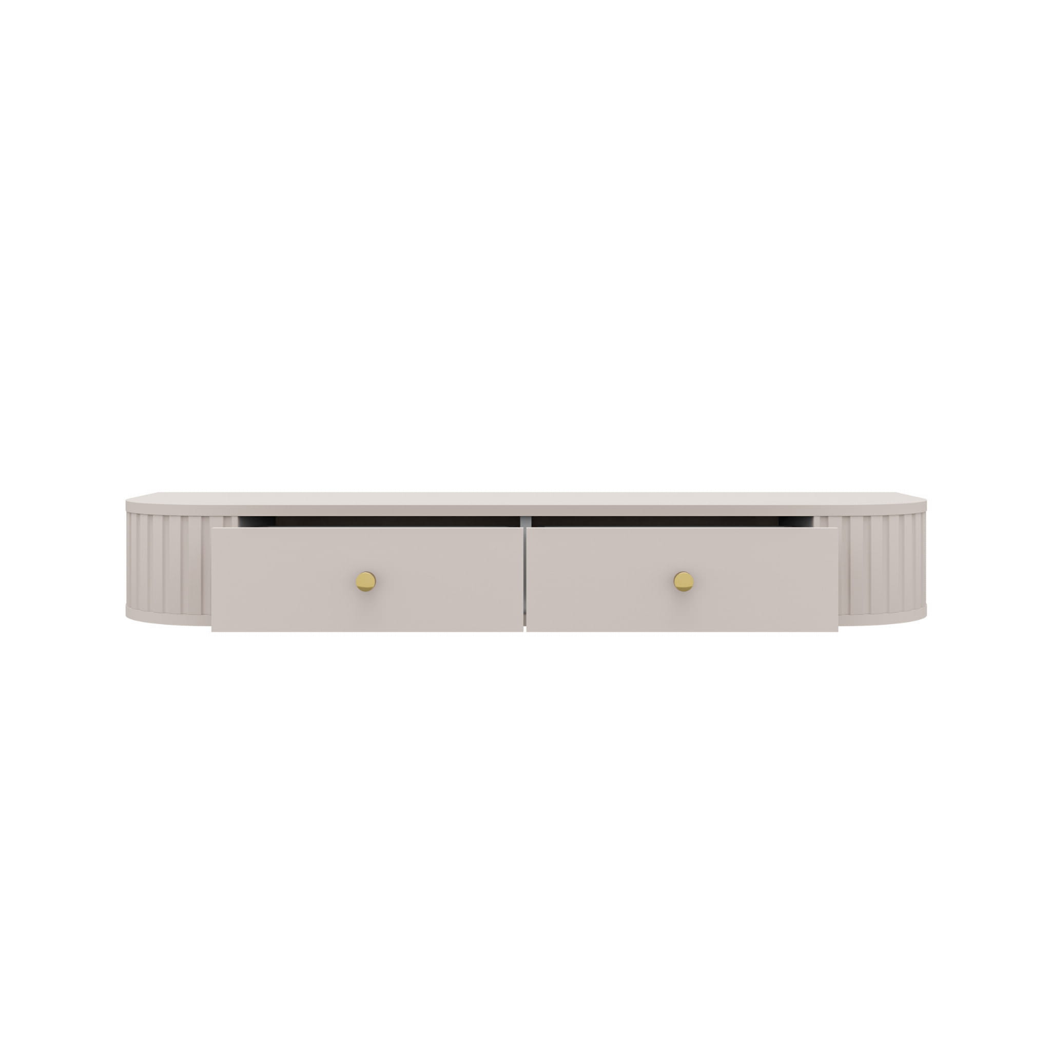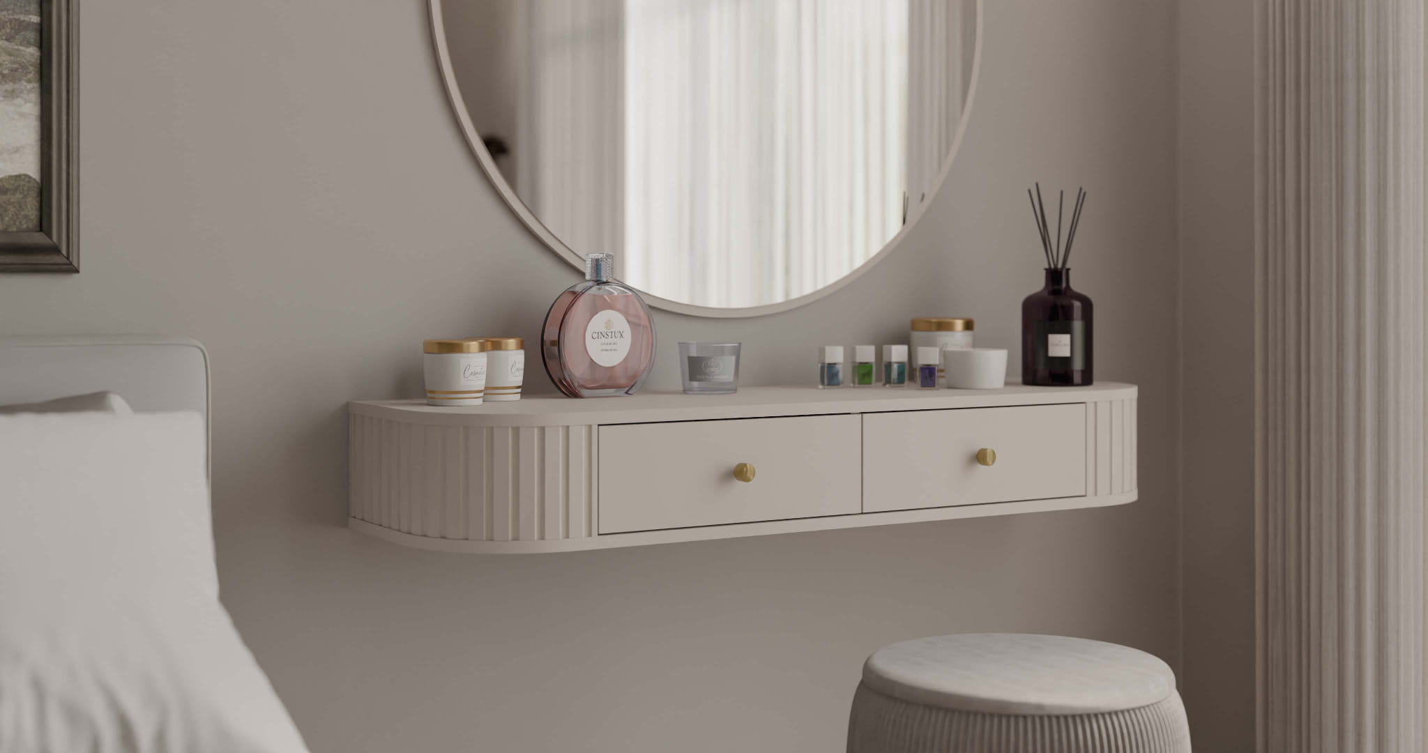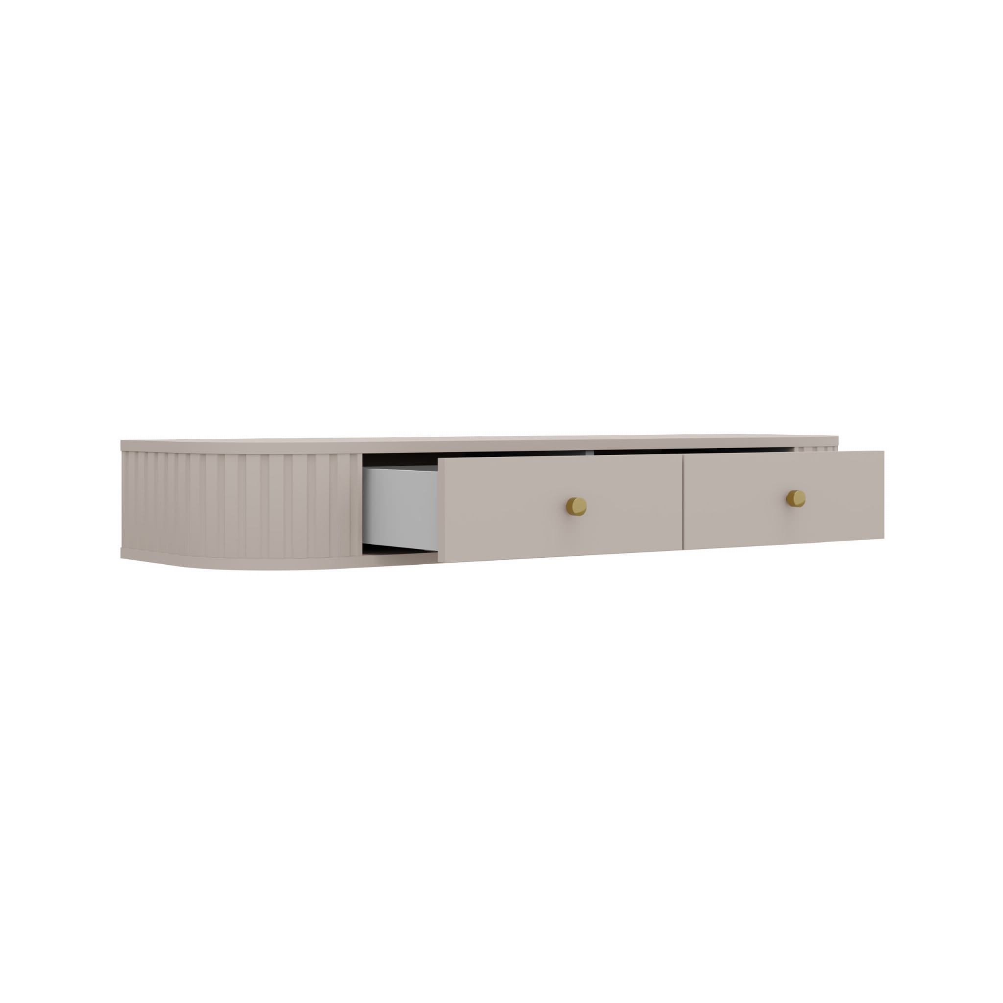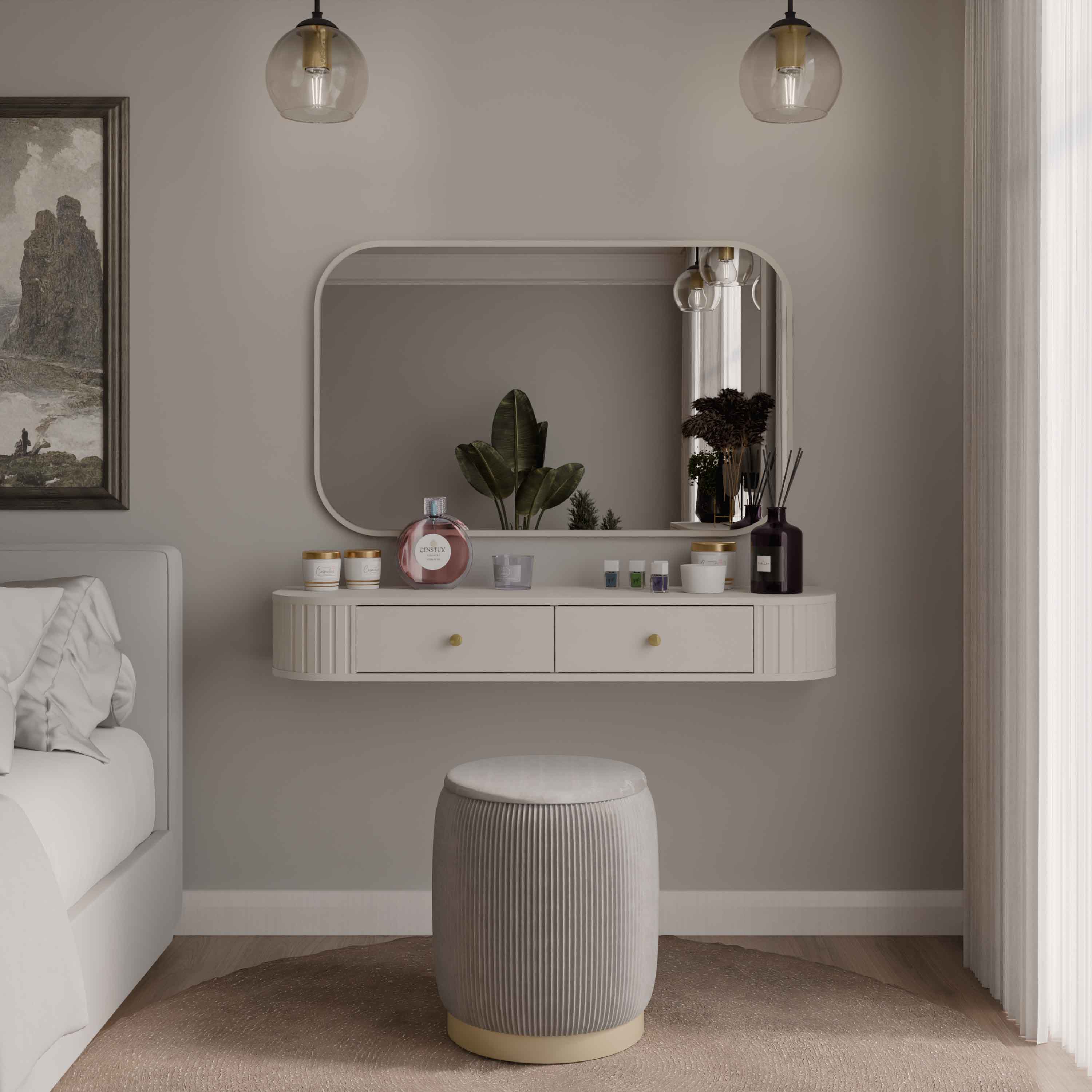 Toaletní stolek je vybaven dvěma praktickými zásuvkami, které jsou ideální pro uložení kosmetiky a drobných doplňků. Jeho lehká, závěsná konstrukce dodává interiéru moderní charakter a vizuálně jej nezatěžuje. Prezentované provedení v barvě béžového písku doplňují elegantní zlaté úchyty, které vytvářejí stylový a jednotný vzhled.