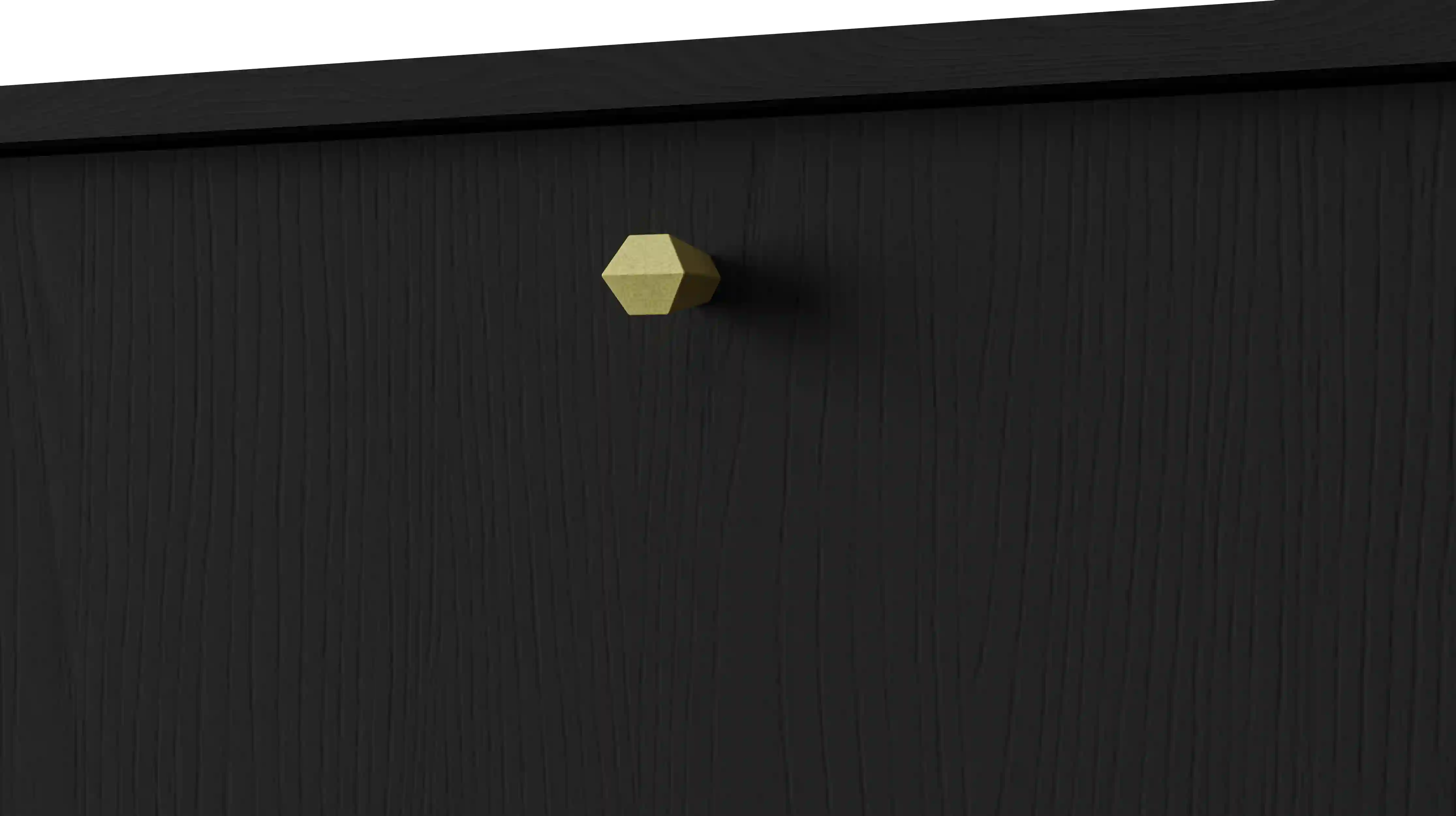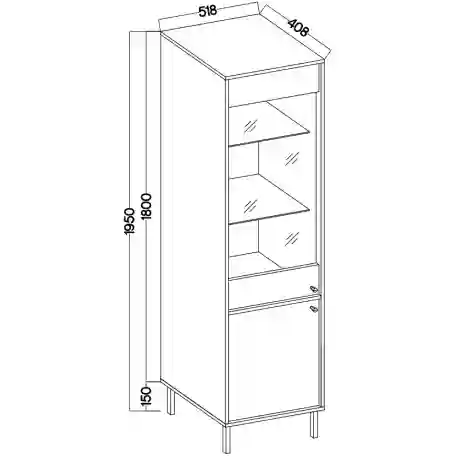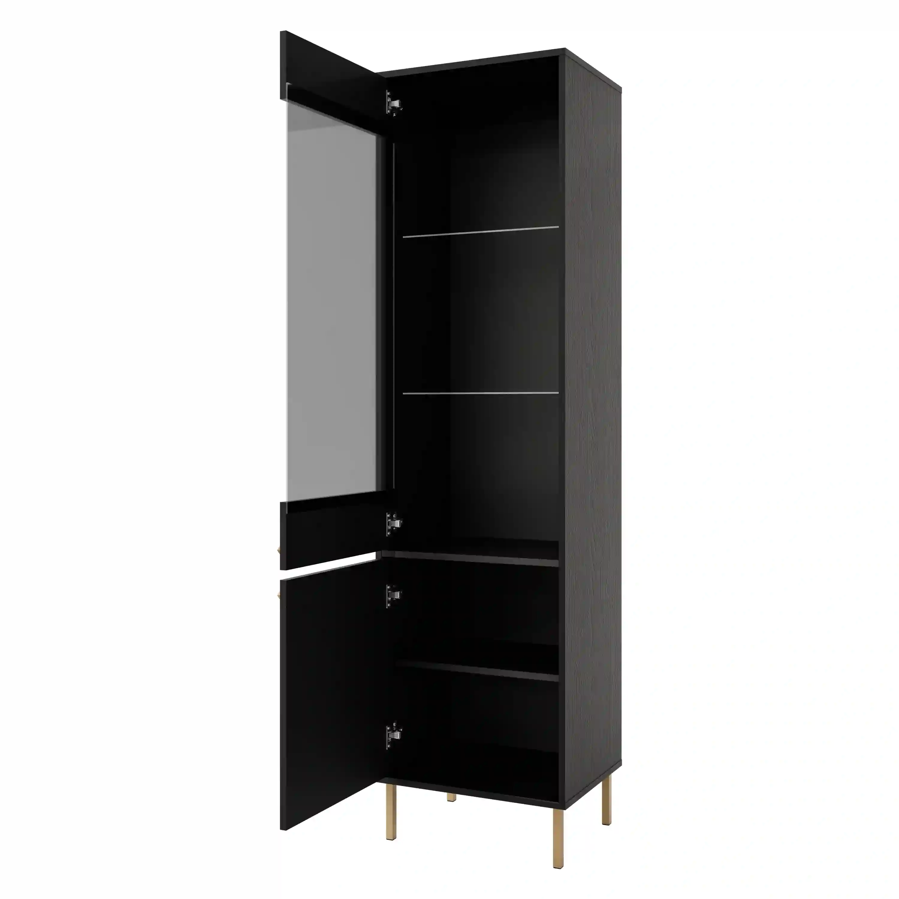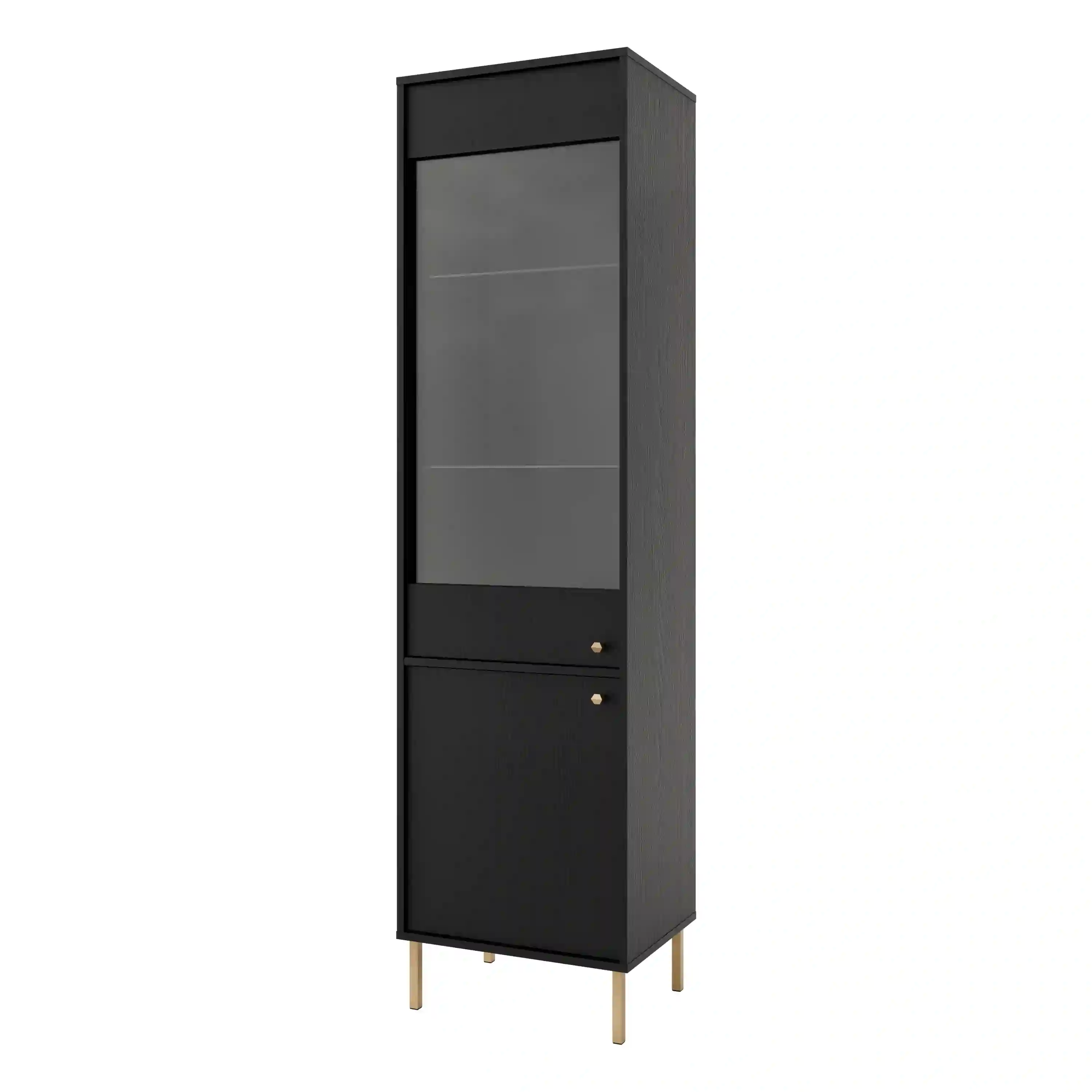Vitrína z kolekce Sakai s dvěma dvířky – horní s tvrzeným antisol sklem v grafitové barvě, dolní plná. Uvnitř se nacházejí tři police, z nichž dvě jsou z 5mm transparentního skla, což dodává lehkost a eleganci. Zlaté kovové knopky zdůrazňují moderní styl. Ideální do obývacího pokoje nebo jídelny, kde spojuje funkci s estetikou.