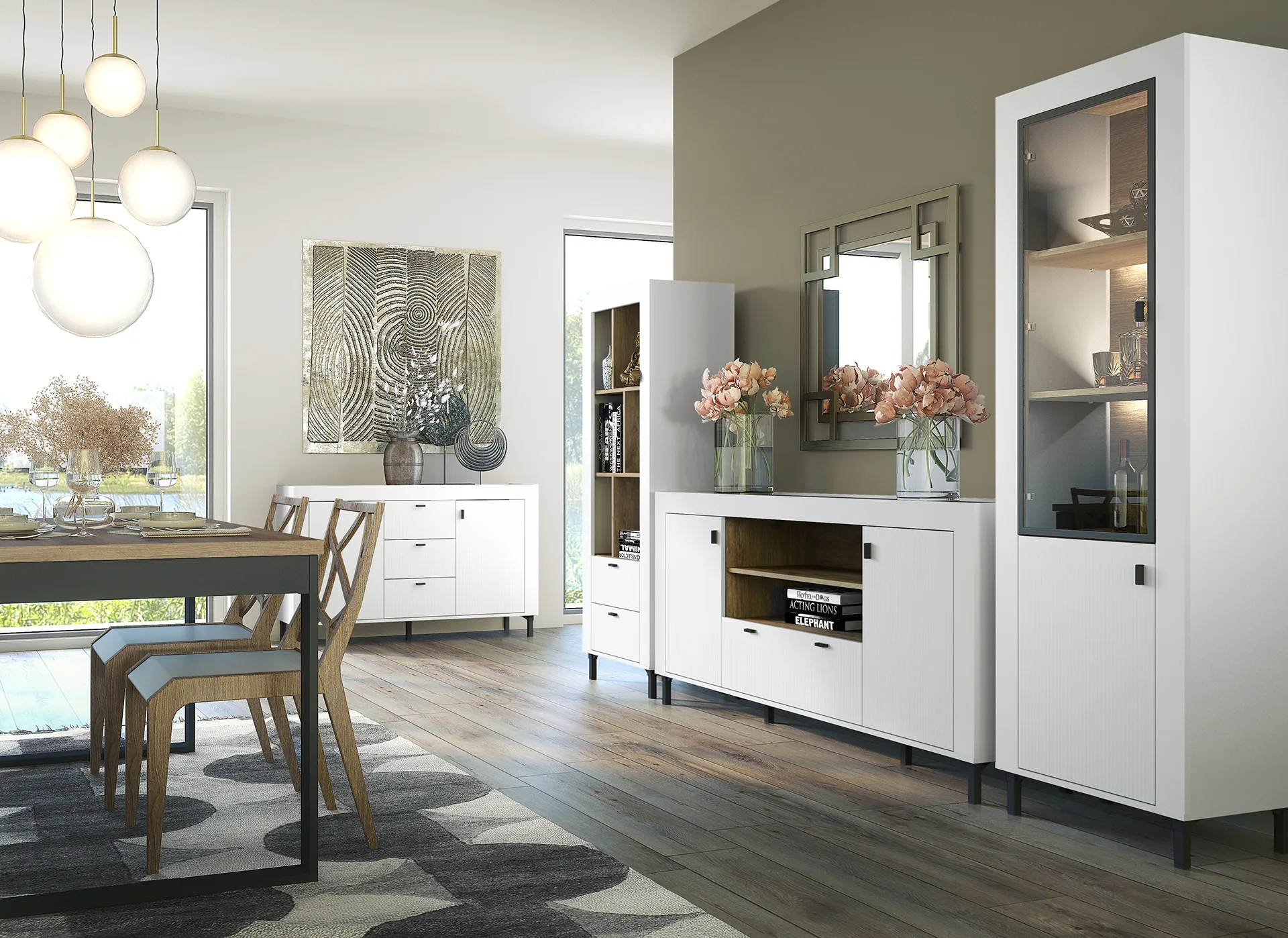 S vitrínou Mossa si můžete vystavit své oblíbené předměty podle svých představ. Díky elegantním skleněným čelům můžete vystavit svou sbírku sklenic, skleniček na stopce a krásně zdobených talířů. Police jsou nejen praktické, ale také estetické, protože umožňují tyto předměty elegantně uspořádat a zdůraznit jejich krásu a jedinečný charakter. Pevná konstrukce nábytku zajišťuje nejen odolnost, ale také bezpečnost uložených předmětů, včetně rodinných fotografií nebo oblíbených krajinek. S vitrínou Mossa budou vaše předměty chráněny a zároveň krásně vystaveny, což vytvoří příjemný a estetický prostor ve vaší domácnosti.