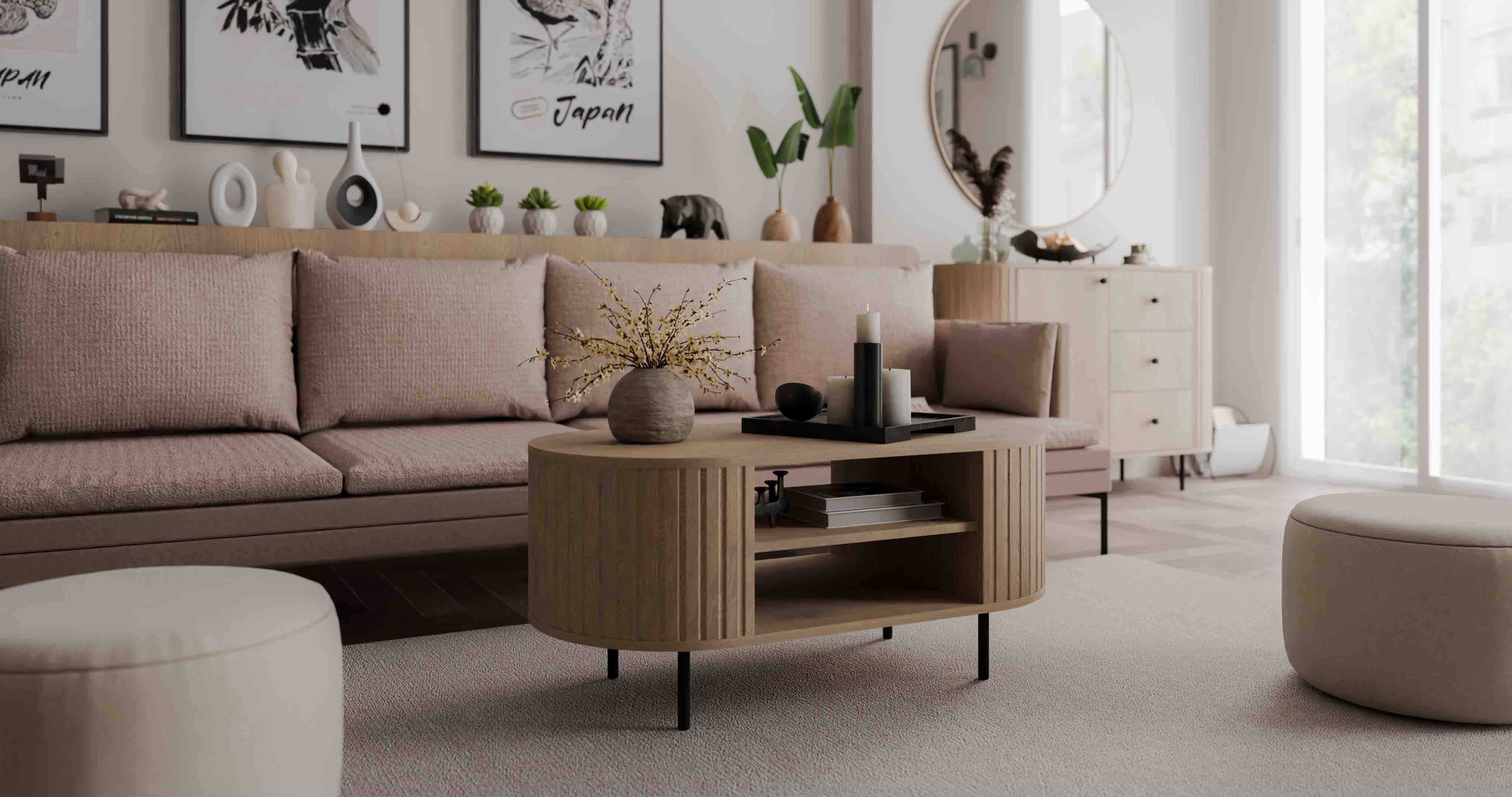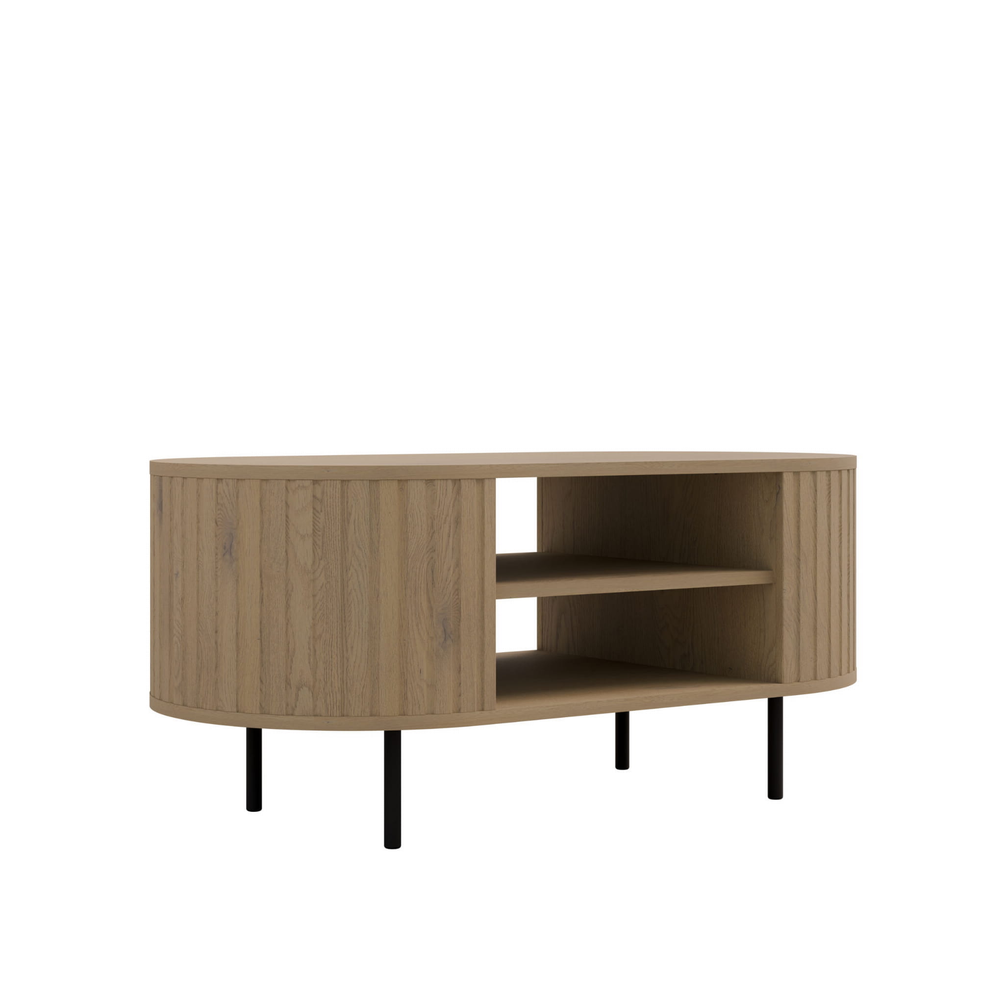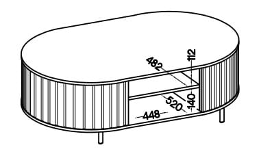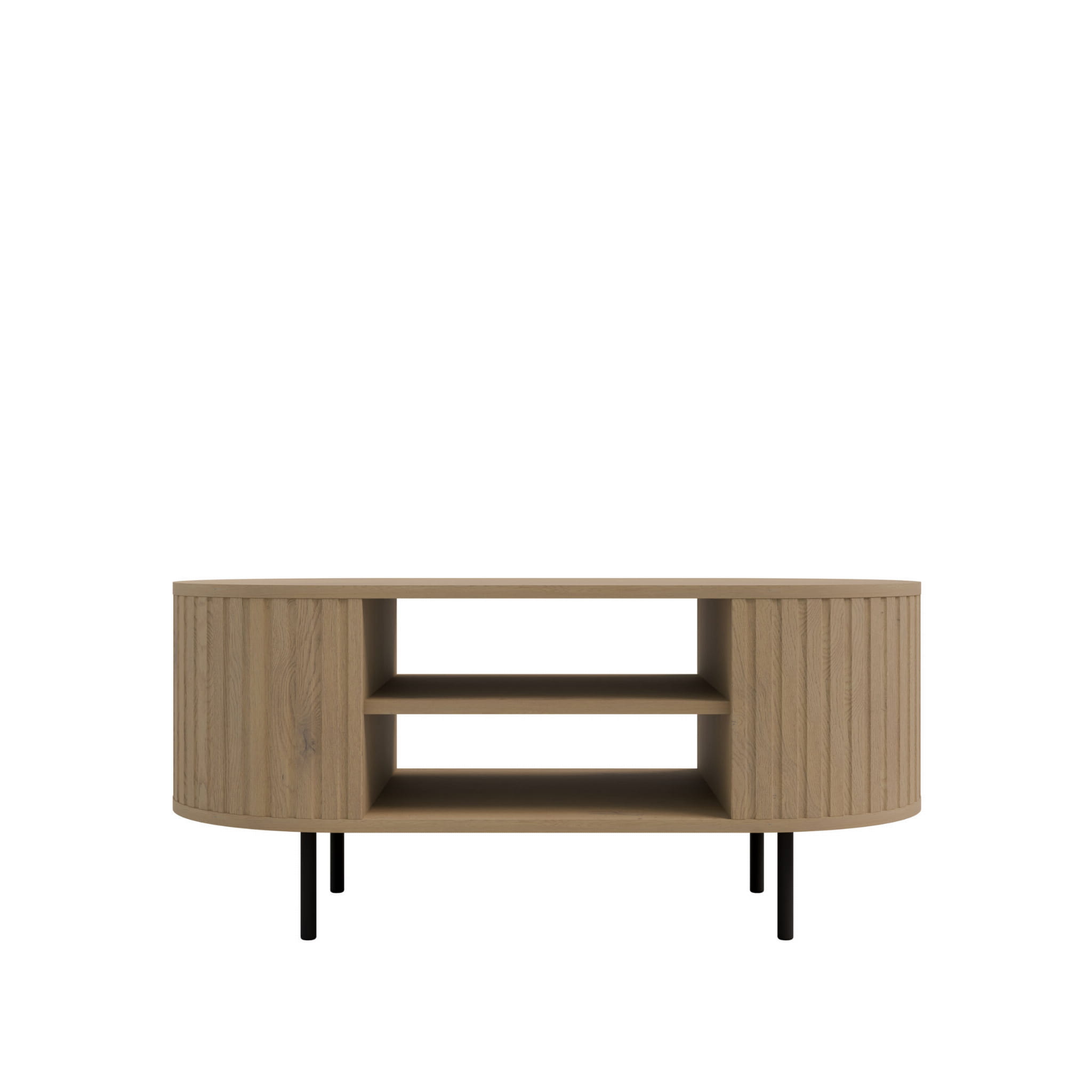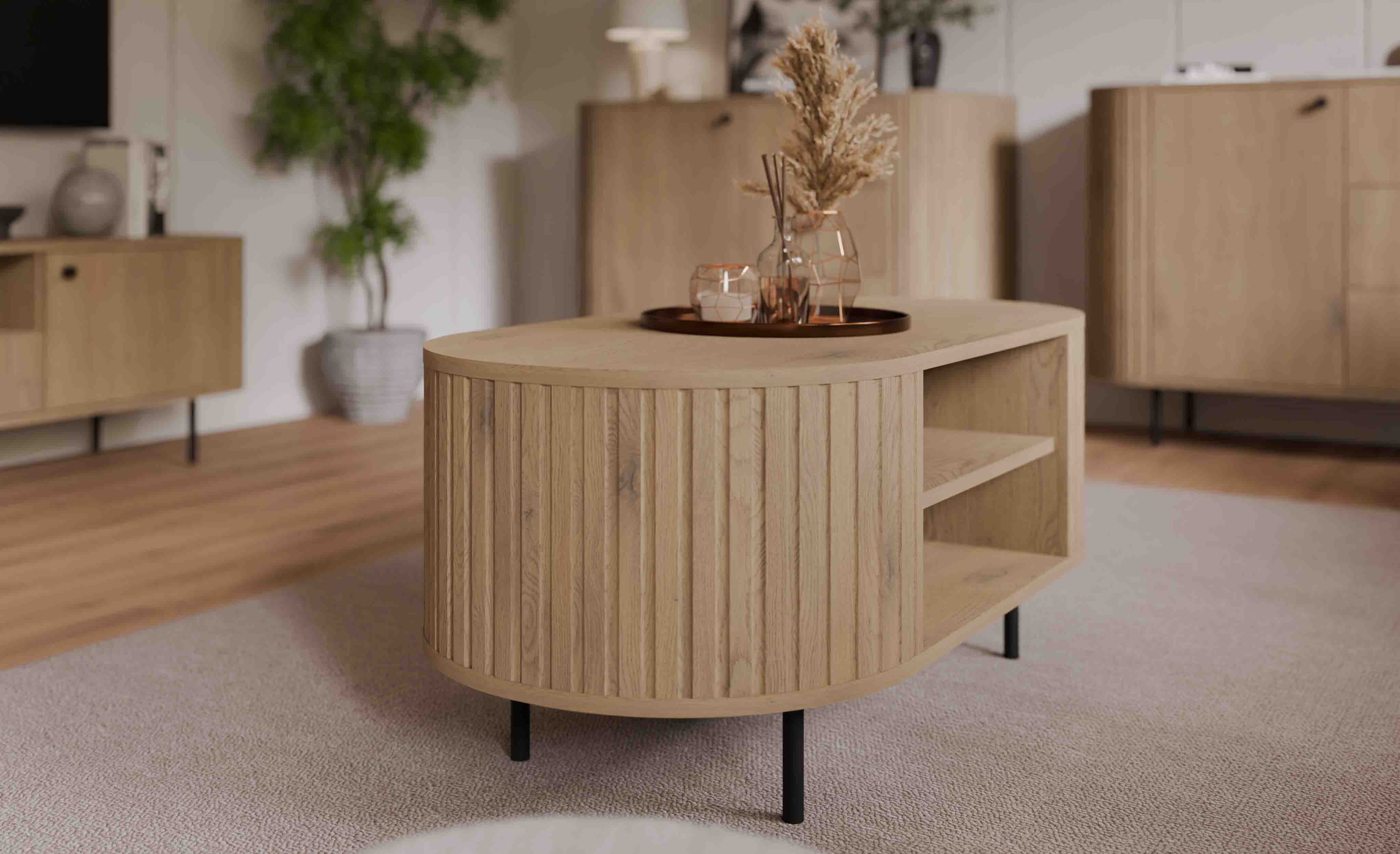 Konferenční stolek z kolekce Flana s oválním, zaobleným horním panelem je praktickým doplňkem odpočinkové zóny. Jedna prostorná police pod deskou umožňuje pohodlně odložit knihy, ovladače nebo časopisy a zachovat přehled na horní ploše. Dekor dub Cremona dodává interiéru teplý, přírodní charakter, zatímco černé kovové nožky podtrhují moderní, lehký vzhled. Vnitřní část stolku je rovněž v dekoru dub Cremona, díky čemuž ladí s ostatními prvky kolekce.