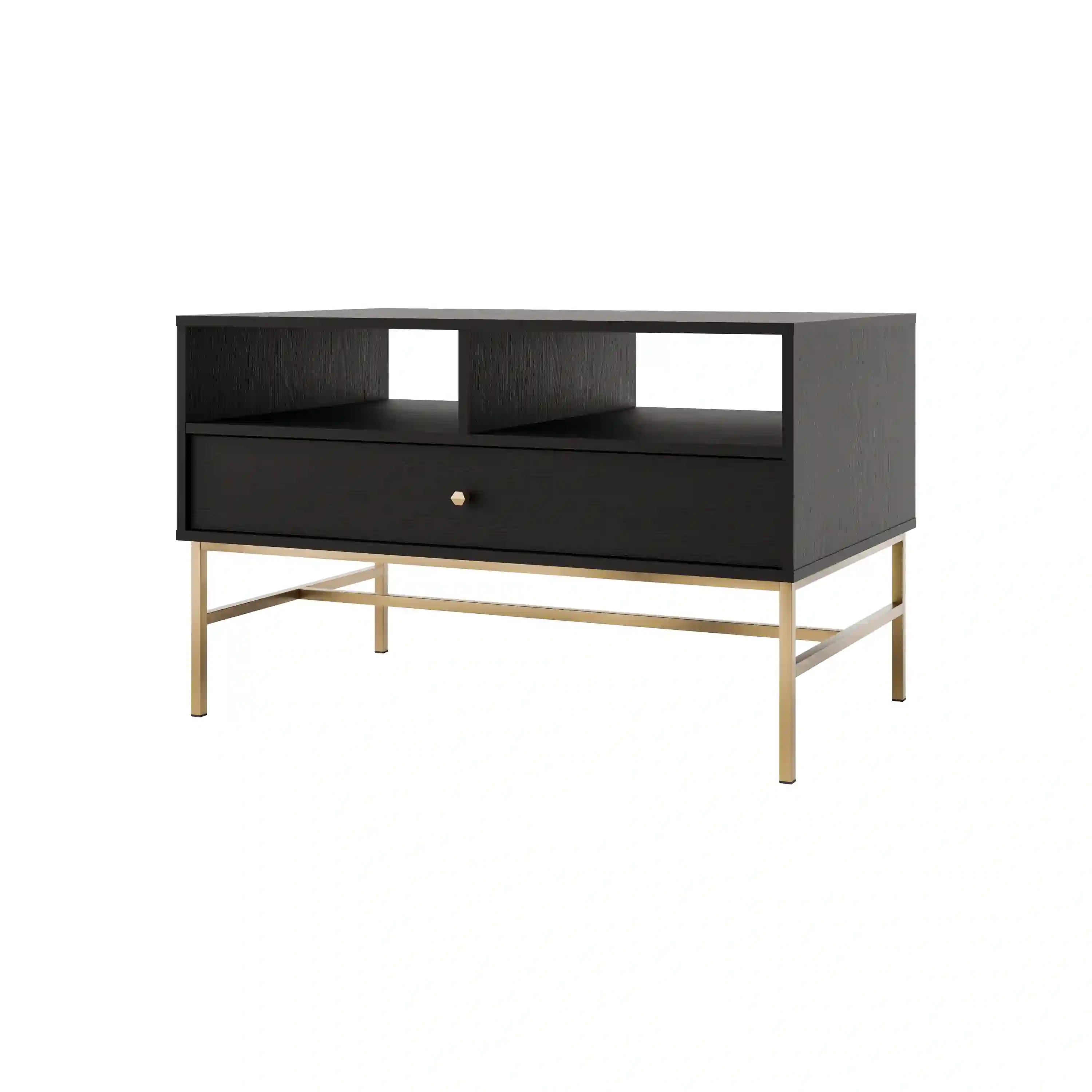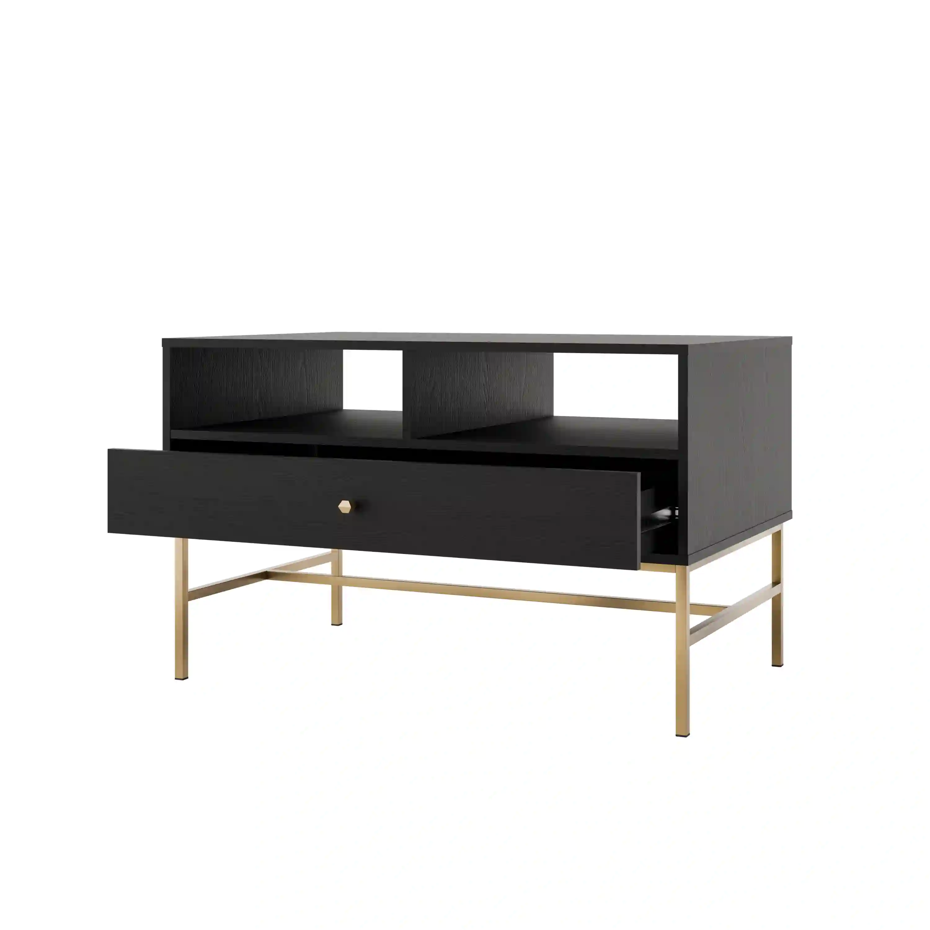 Konferenční stolek spojuje funkčnost s moderním designem. Vybaven jednou prostornou zásuvkou nabízí pohodlné úložiště pro ovladače, časopisy či jiné drobnosti, které chcete mít po ruce, ale skryté před zraky. Zásuvka je na kuličkových pojezdech pro plynulé a tiché otevírání a zavírání, a zlaté kovové knopky přidávají nábytku na eleganci.