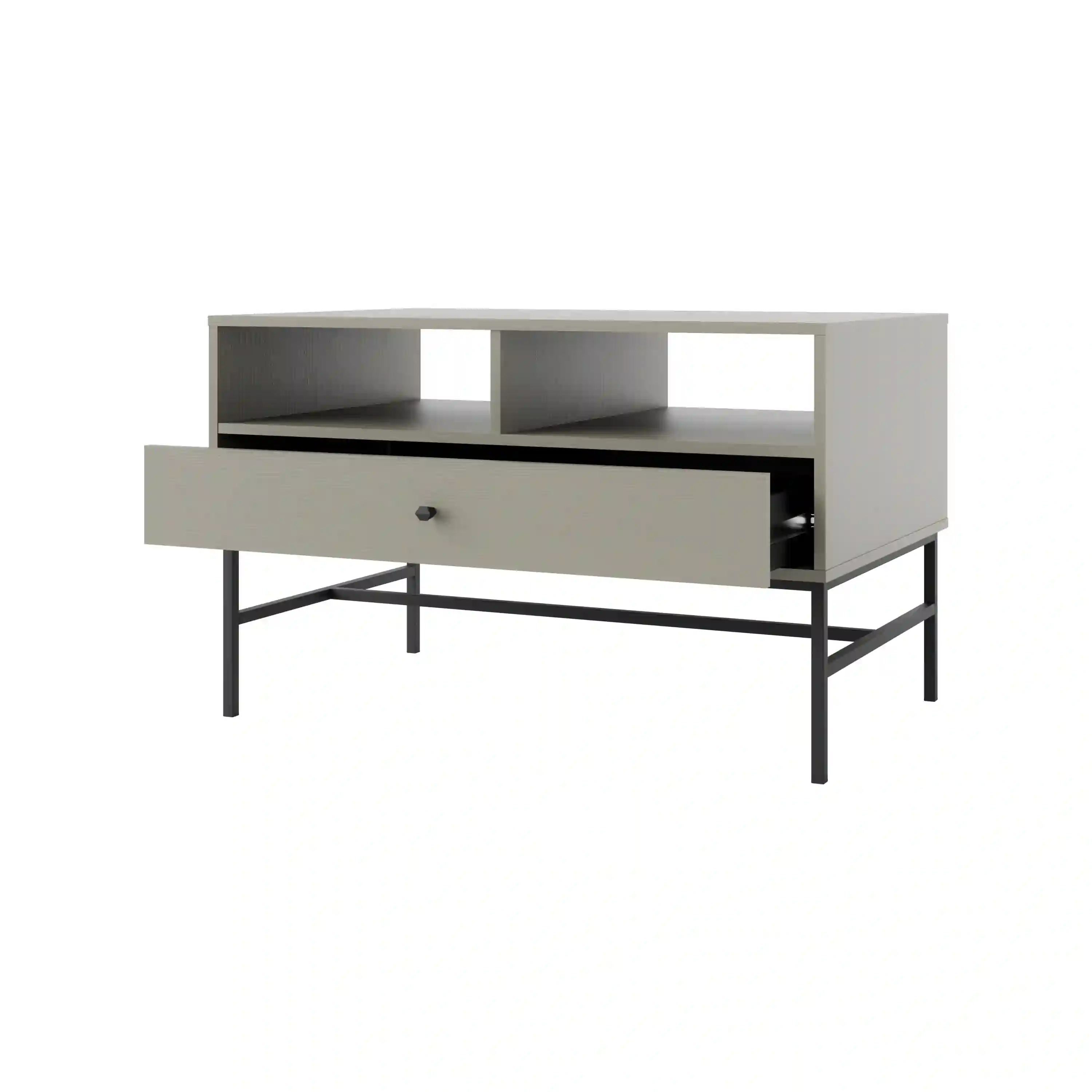 Konferenční stolek spojuje funkci s moderním designem. Je vybaven jednou prostornou zásuvkou, která nabízí pohodlné úložné místo pro malé předměty jako dálkové ovladače, časopisy či jiné doplňky, které chcete mít po ruce, ale zároveň schované. Zásuvka je na kuličkových pojezdech, což zajišťuje plynulé a tiché otevírání a zavírání, a černé kovové knopky dodávají stolku šmrnc a eleganci.